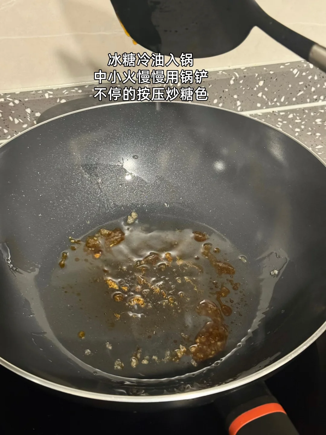 3. 冰糖冷油入锅中小火慢慢用锅铲不停的按压炒糖色