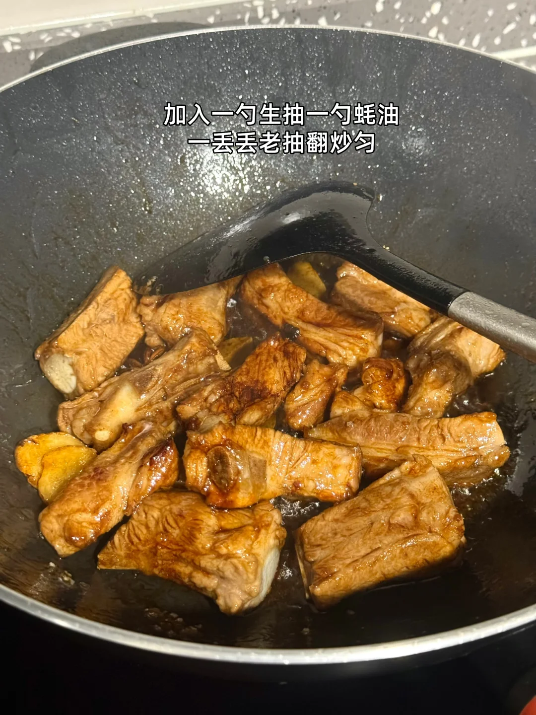 4. 沥干水的排骨放进锅里快速翻炒加入生姜香料