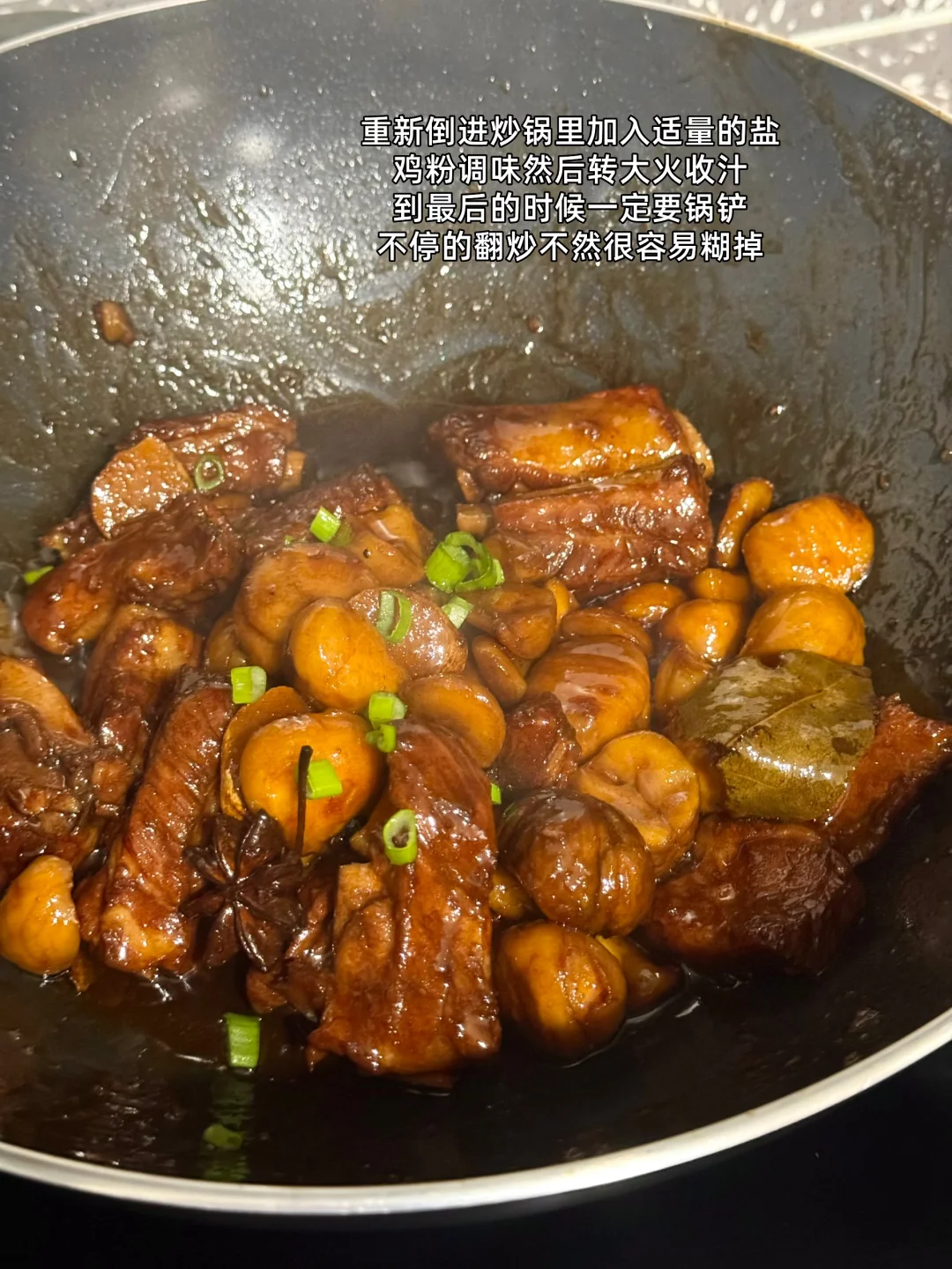 8. 重新倒进炒锅里加入适量的盐鸡粉调味然后转大火收汁到最后的时候一定要锅铲不停的翻炒不然很容易糊掉