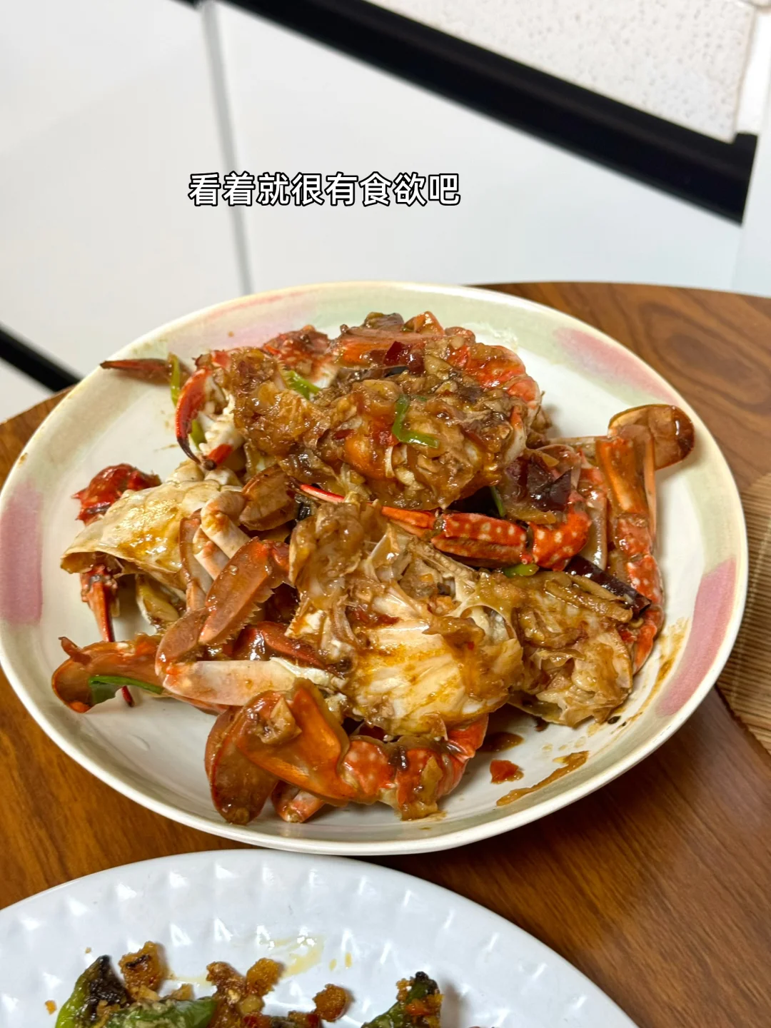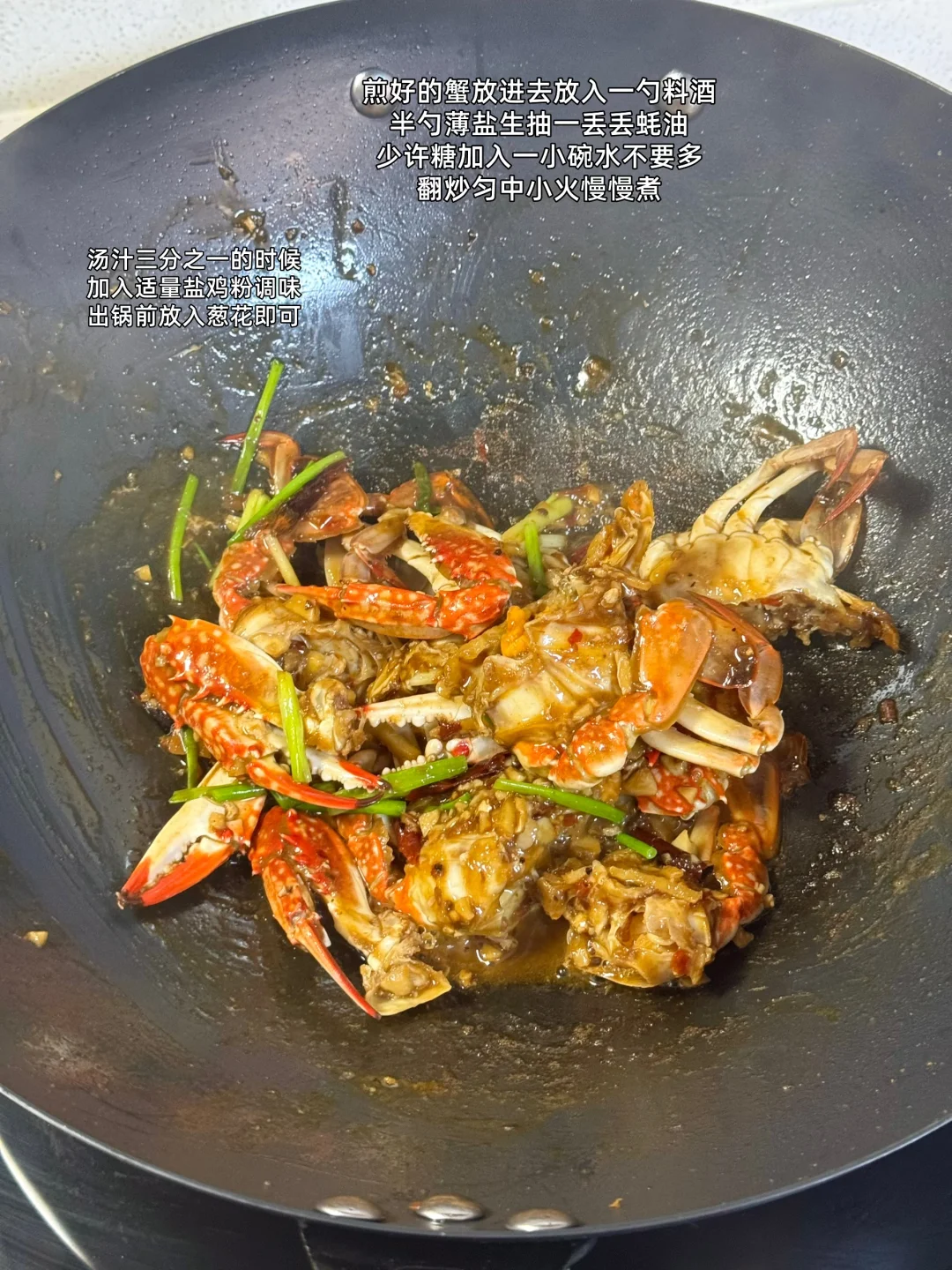 1. 先处理梭子蟹把那个壳掰开把里面的腮弄掉然后肚子上的那个也掰掉然后一分为二就可以 2. 切面粘少量的淀粉 3. 锅里放入少许油粘好淀粉的蟹放进去小火煎至金黄 4. 小火爆香大蒜生姜小米辣碎然后还放了一点新鲜的花椒放入一勺豆瓣酱小火慢慢炒出红油 5. 汤汁三分之一的时候加入适量盐鸡粉调味 出锅前放入葱花即可