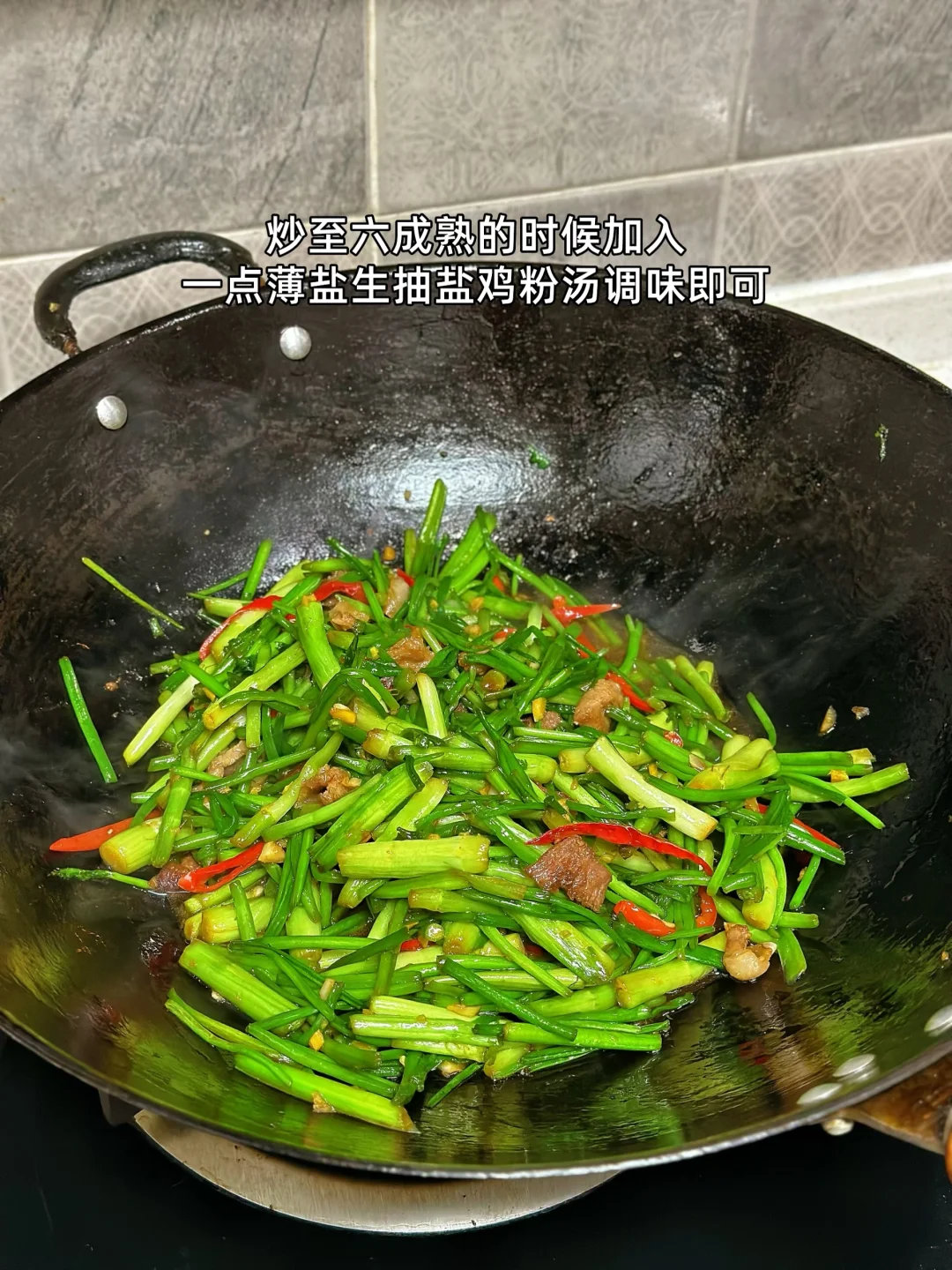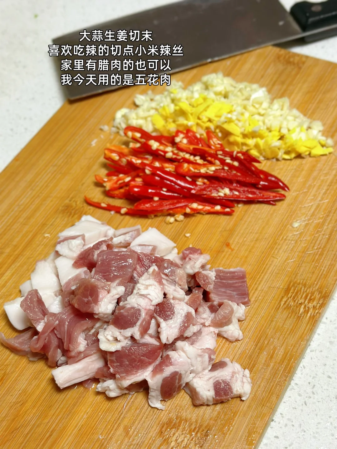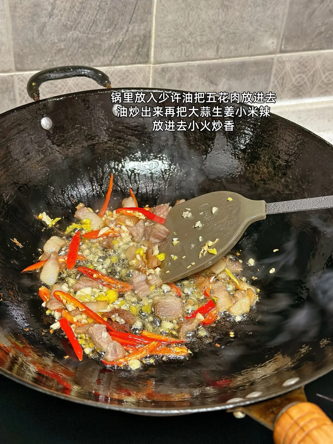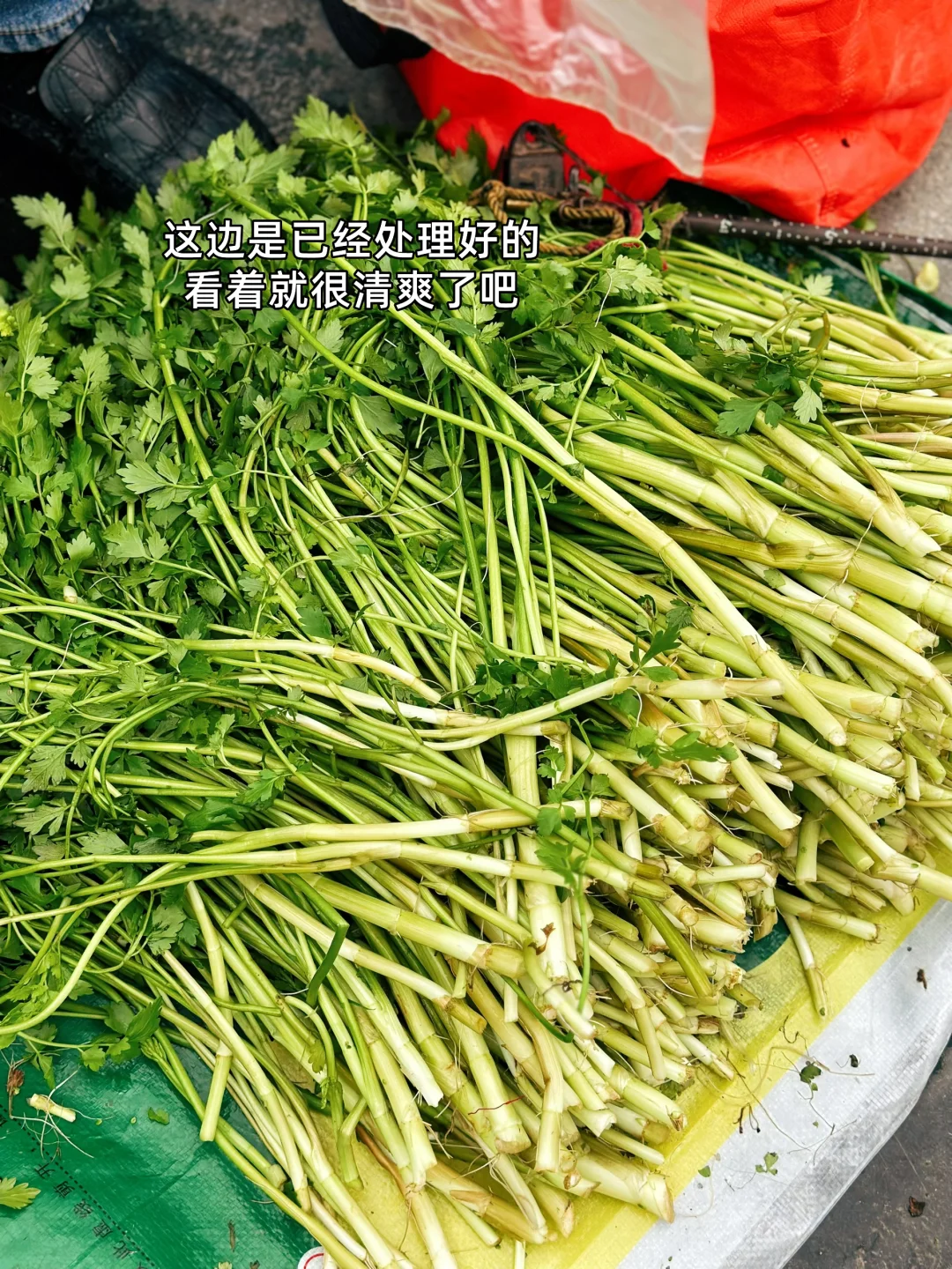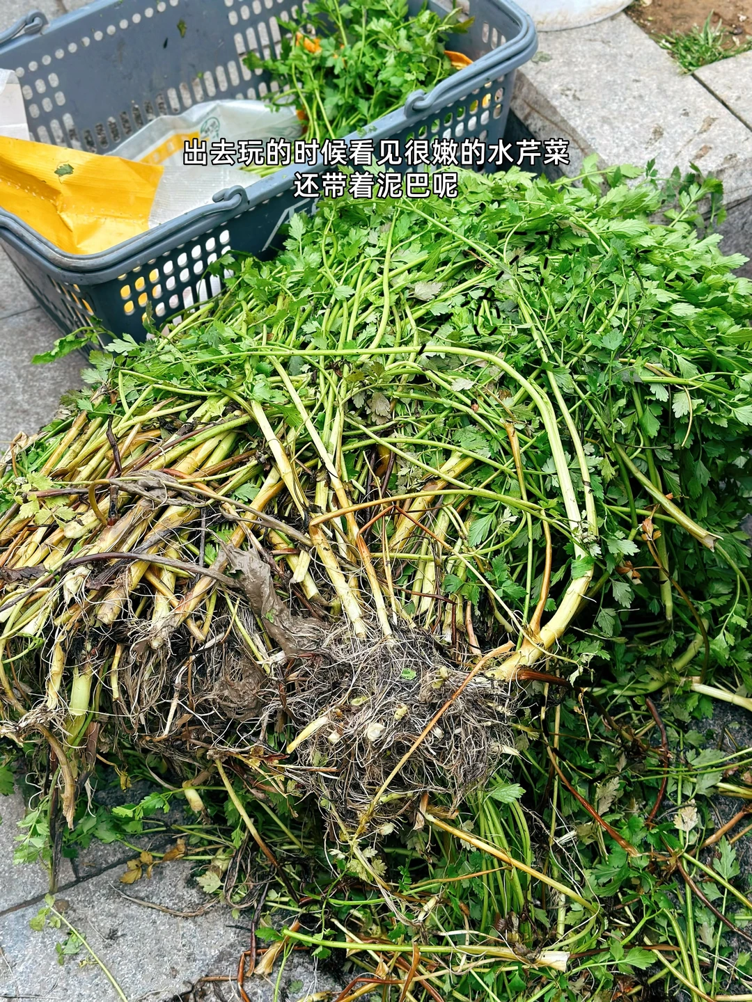 1. 出去玩的时候看见很嫩的水芹菜还带着泥巴呢 2. 水芹菜买回来之后一定要给它彻底的洗干净那个里面很多泥巴我是把头上老的这一节也给它切掉了 3. 切成这样的长段就可以了 4. 大蒜生姜切末喜欢吃辣的切点小米辣丝家里有腊肉的也可以我今天用的是五花肉 5. 锅里放入少许油把五花肉放进去油炒出来再把大蒜生姜小米辣放进去小火炒香 6. 加入一勺料酒炒干水分之后再放一丢丢,老抽上个色 7. 沥干水的小芹菜放进去转大火翻炒哦这个时候一定要 8. 炒至六成熟的时候加入一点薄盐生抽盐鸡粉汤调味即可