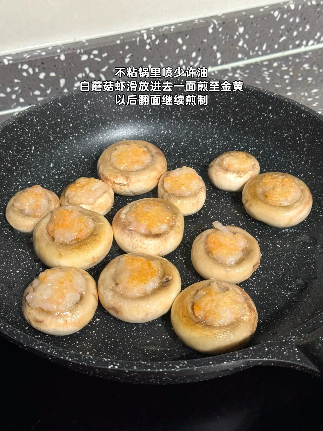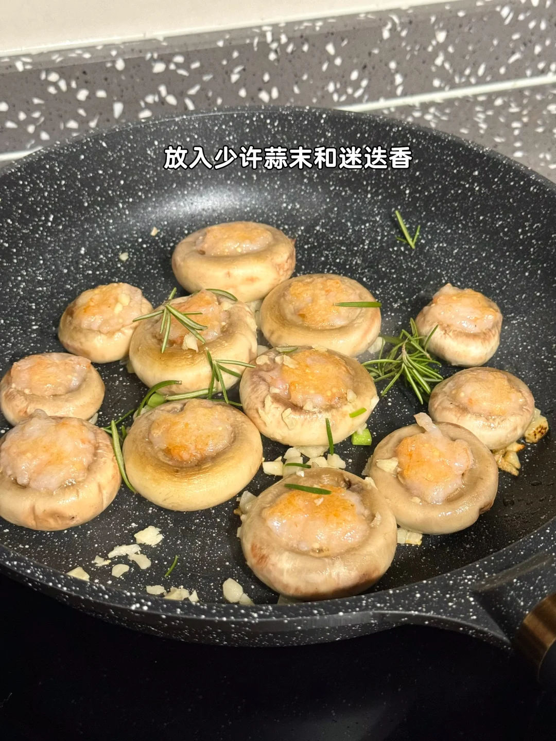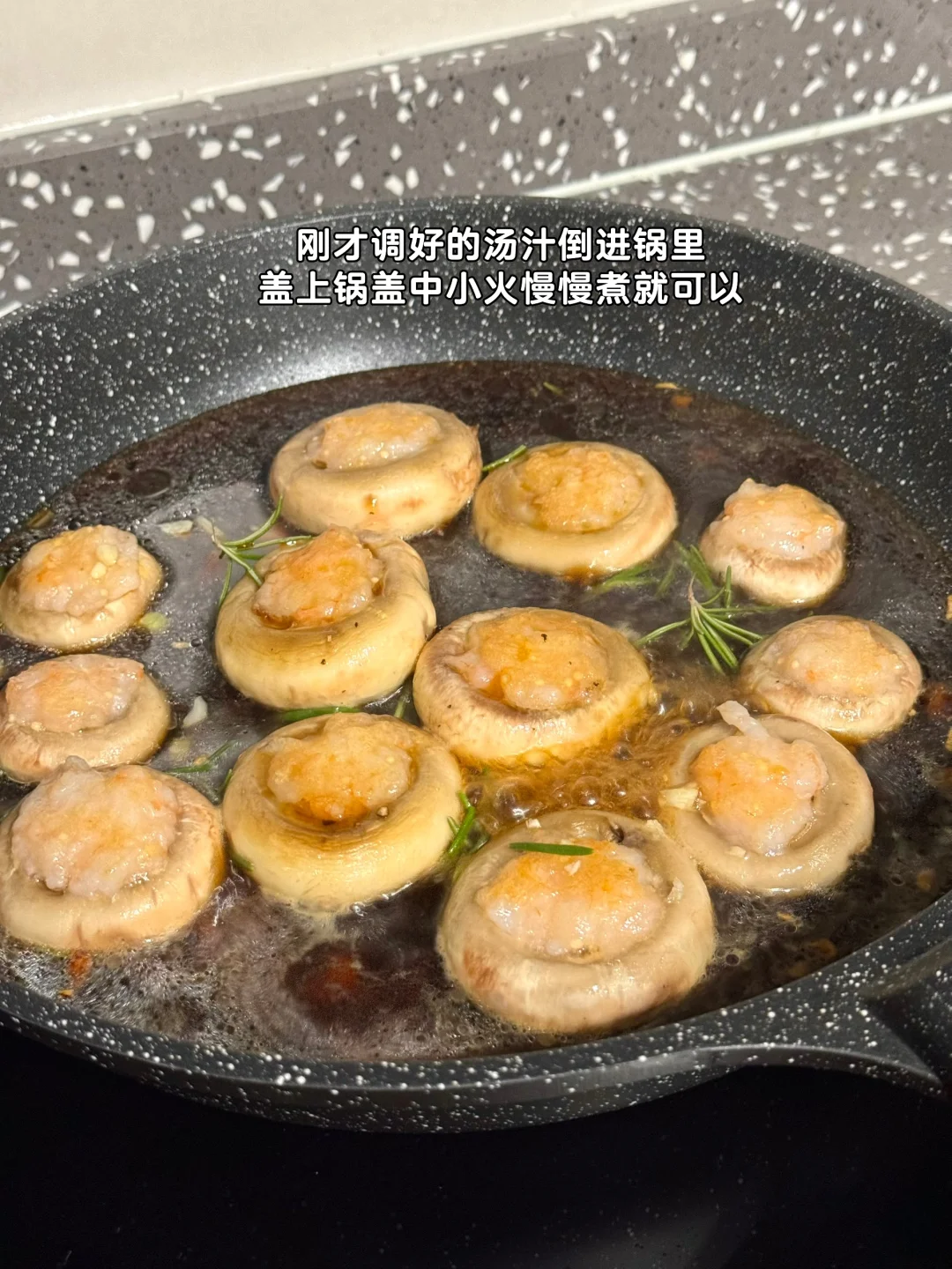 1. 白蘑菇清洗干净,把虾滑挤进去别挤太多哦 2. 两勺生抽一勺老抽一勺蚝油适量糖一勺淀粉 半碗清水,我还磨了一些胡椒碎进去,适量鸡粉 搅匀之后尝一下咸淡 3.不粘锅里喷少许油白蘑菇虾滑放进去一面煎至金黄以后翻面继续煎制 4. 放入少许蒜末和迷迭香 5. 刚才调好的汤汁倒进锅里盖上锅盖中小火慢慢煮就可以 6. 收汁的时候可以转大火也不用收的太干放点在盘子里面会更好看
