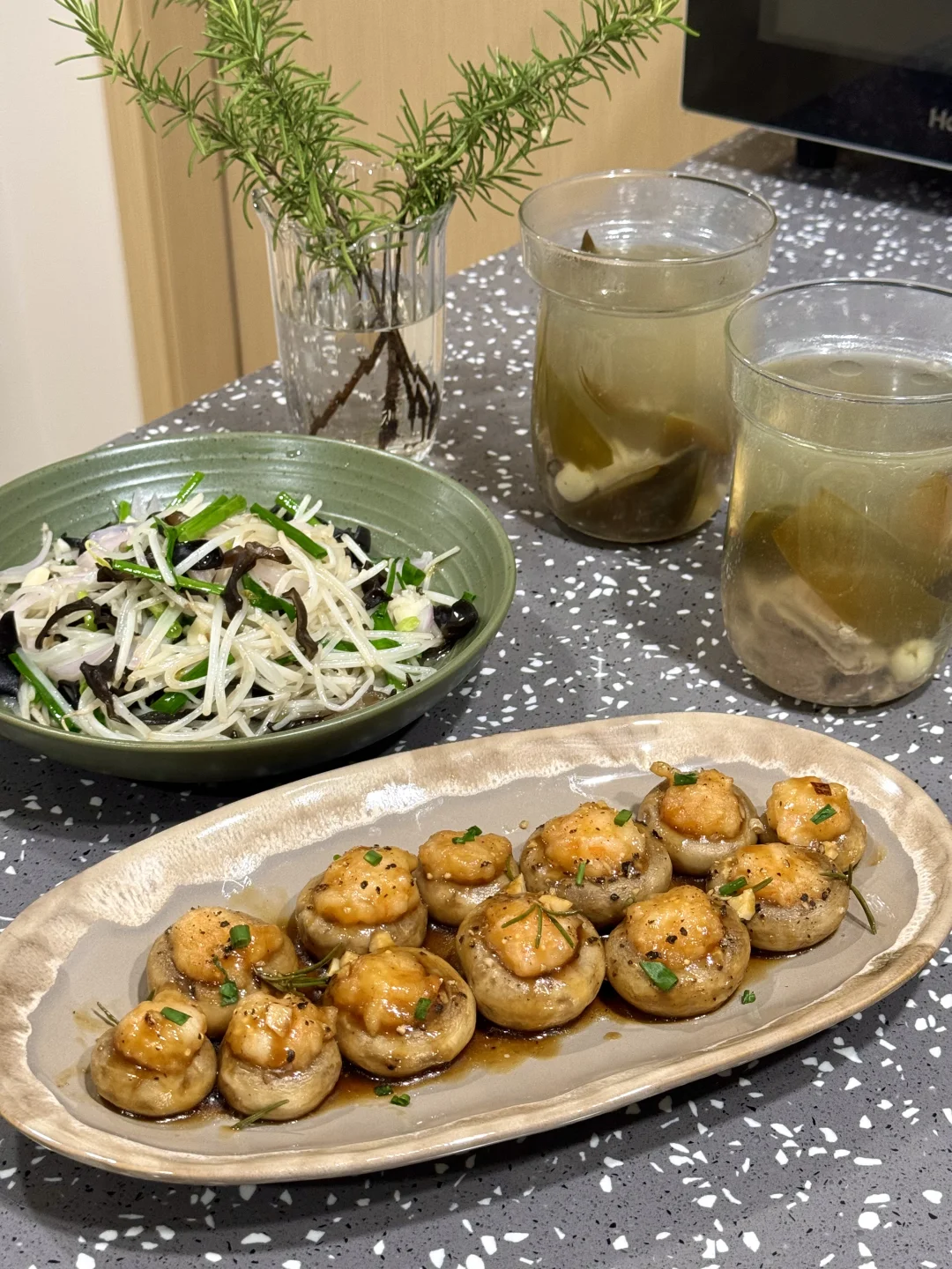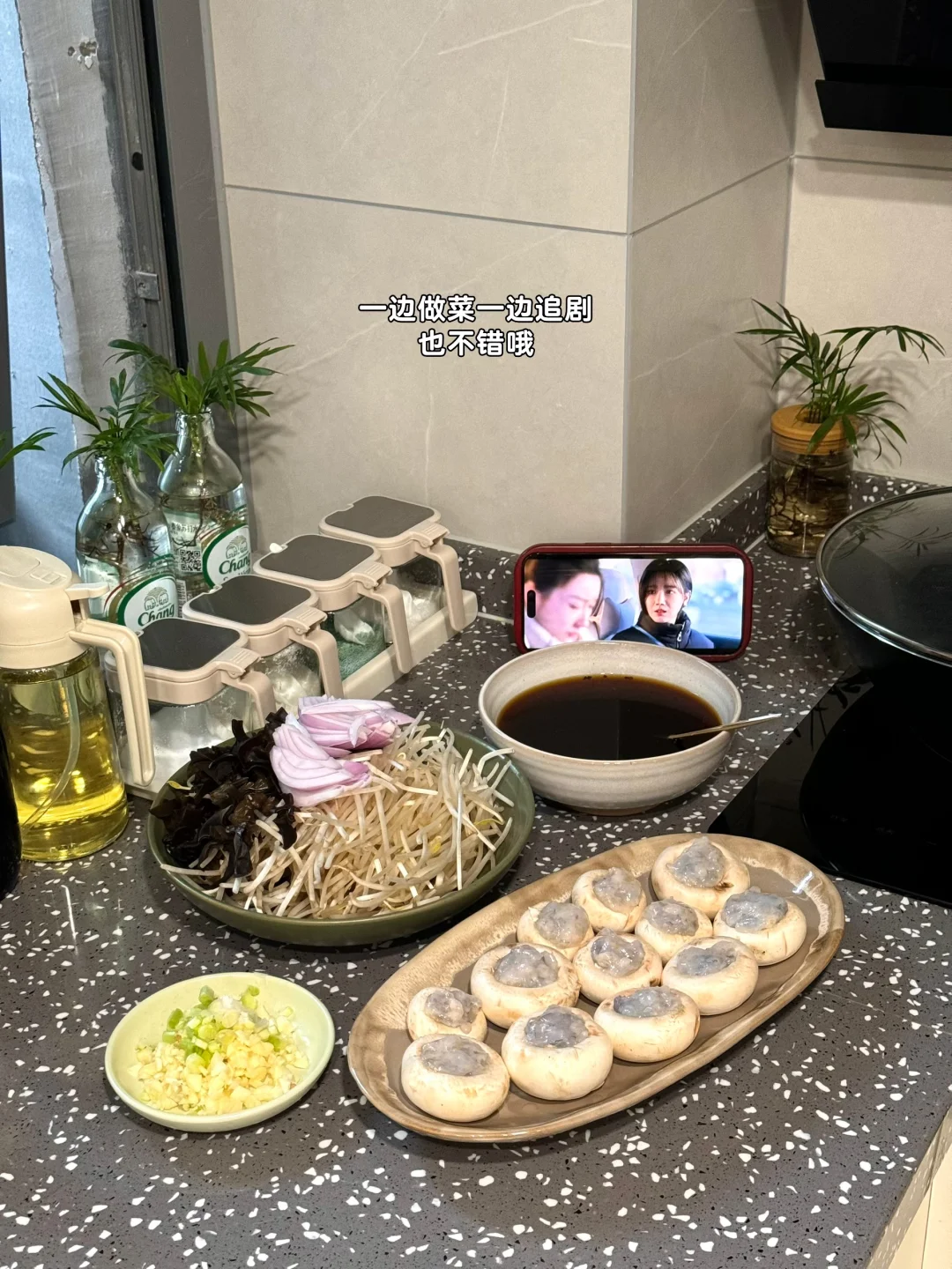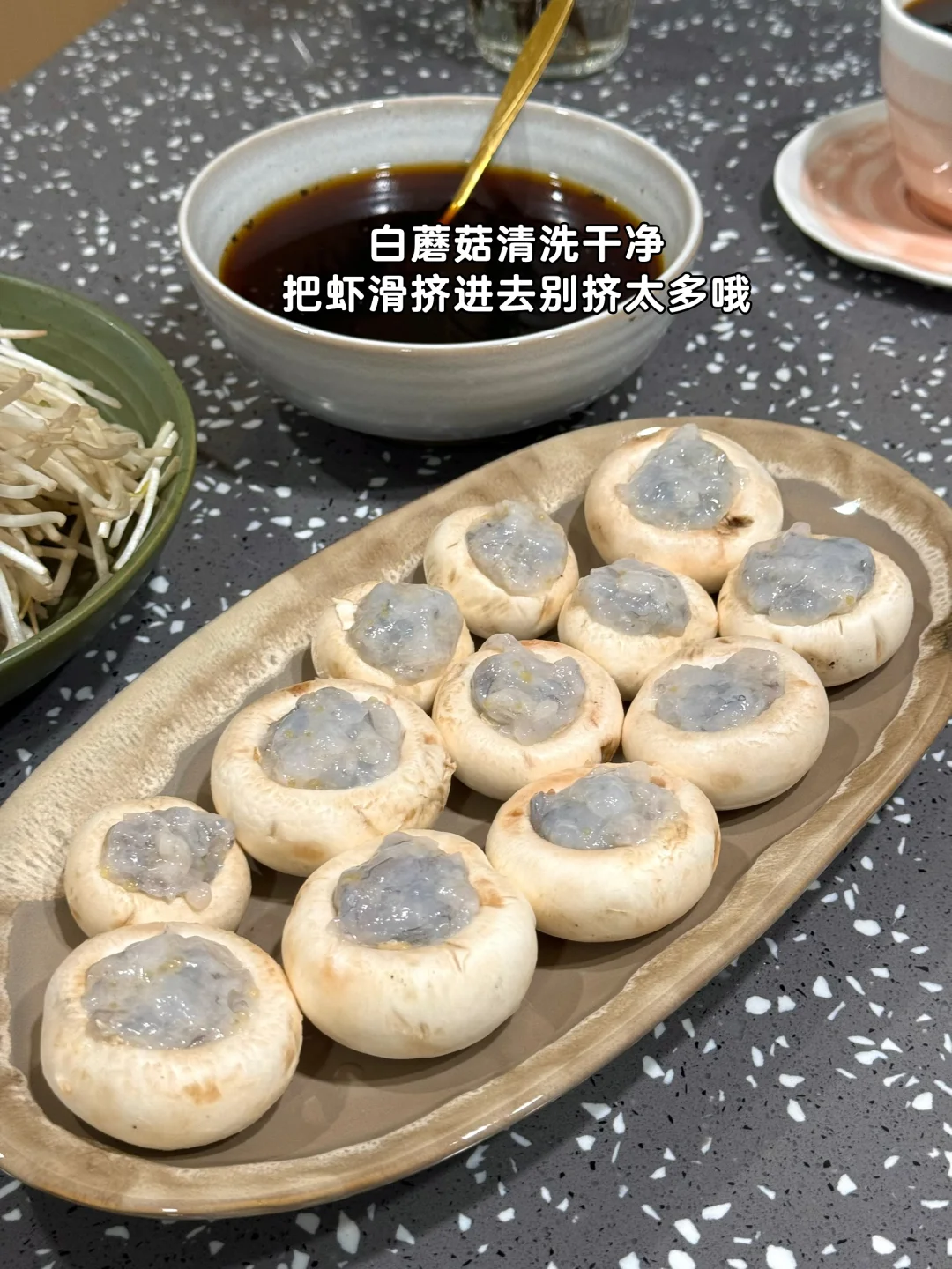 1. 白蘑菇清洗干净,把虾滑挤进去别挤太多哦 2. 两勺生抽一勺老抽一勺蚝油适量糖一勺淀粉 半碗清水,我还磨了一些胡椒碎进去,适量鸡粉 搅匀之后尝一下咸淡 3.不粘锅里喷少许油白蘑菇虾滑放进去一面煎至金黄以后翻面继续煎制 4. 放入少许蒜末和迷迭香 5. 刚才调好的汤汁倒进锅里盖上锅盖中小火慢慢煮就可以 6. 收汁的时候可以转大火也不用收的太干放点在盘子里面会更好看