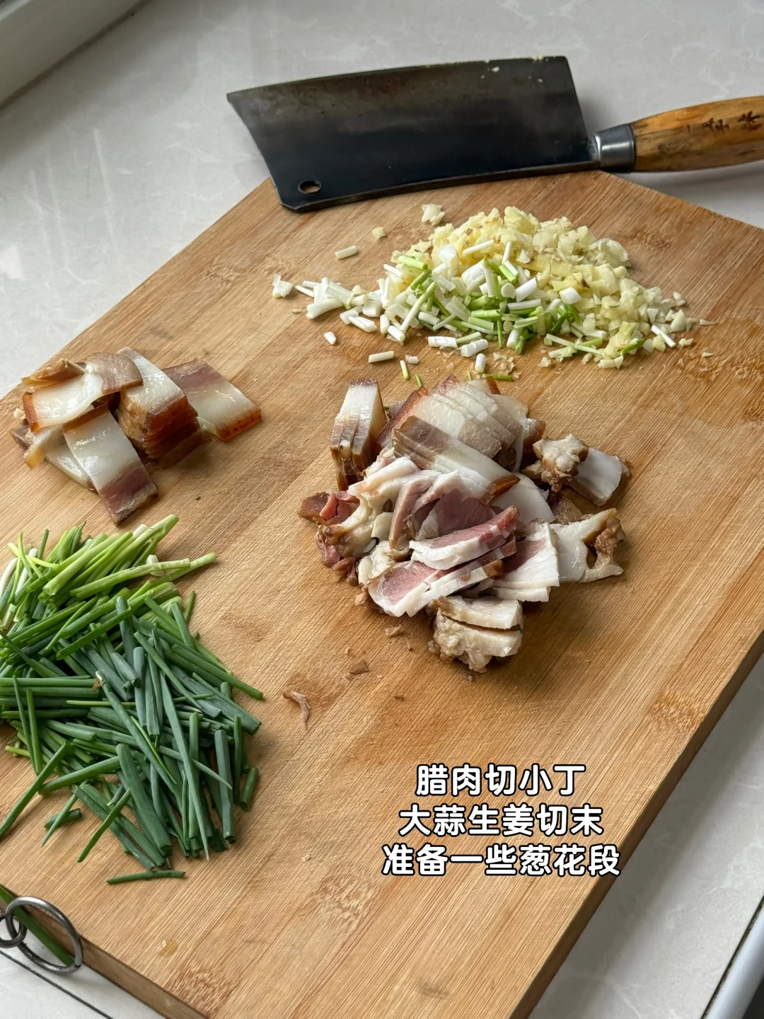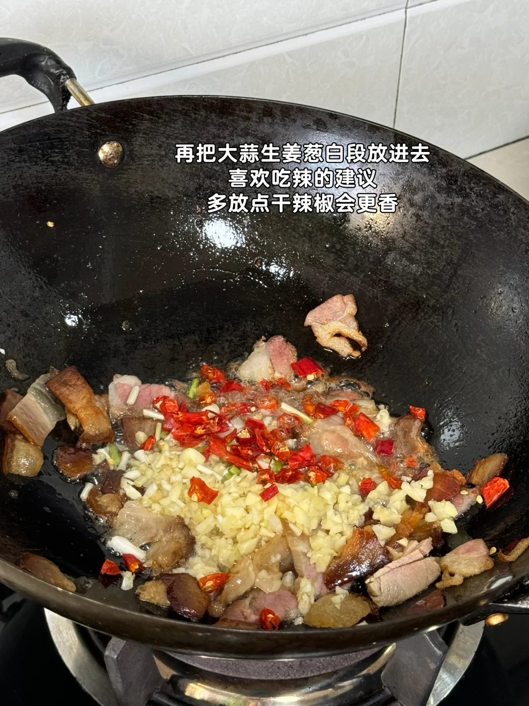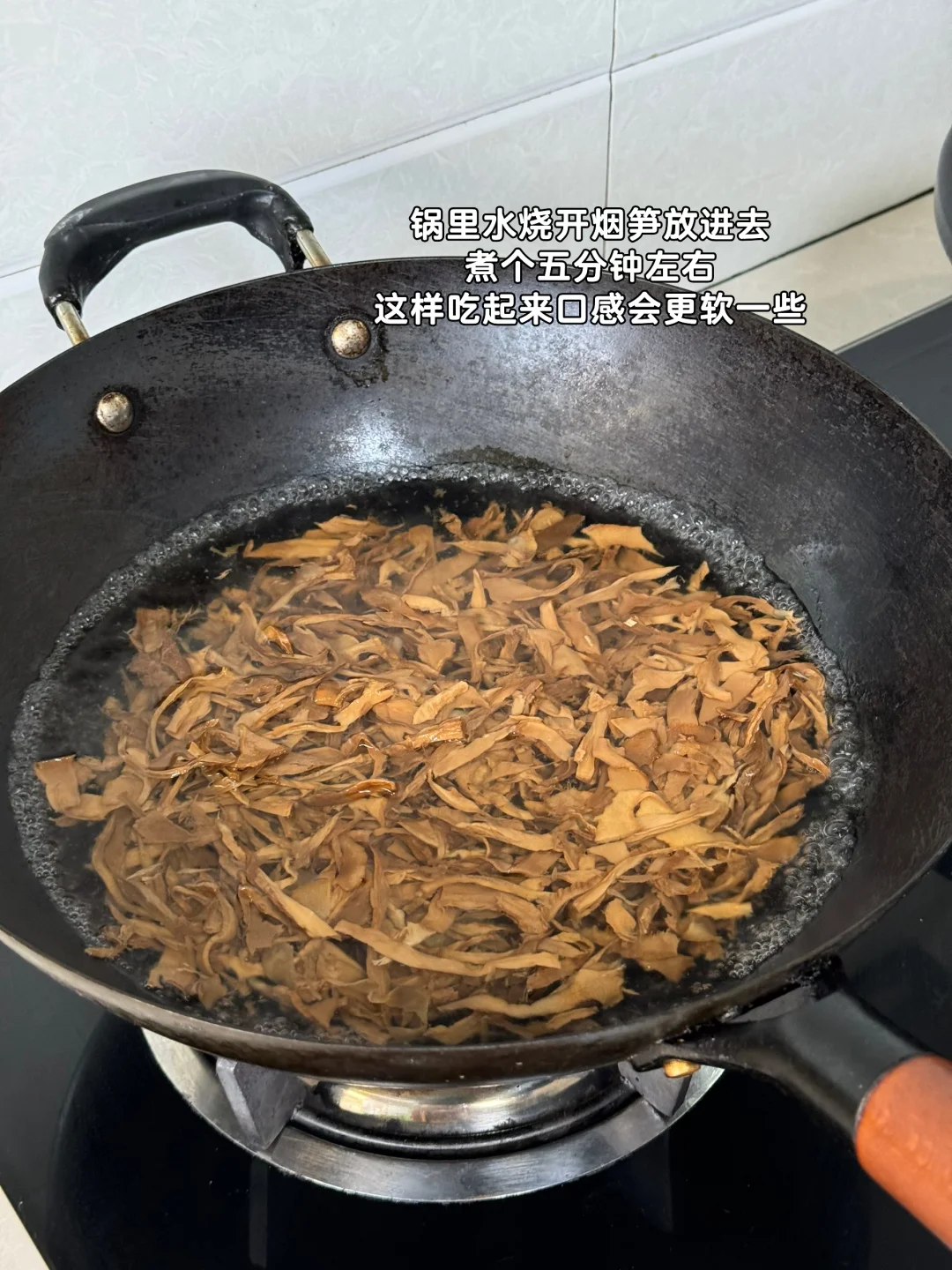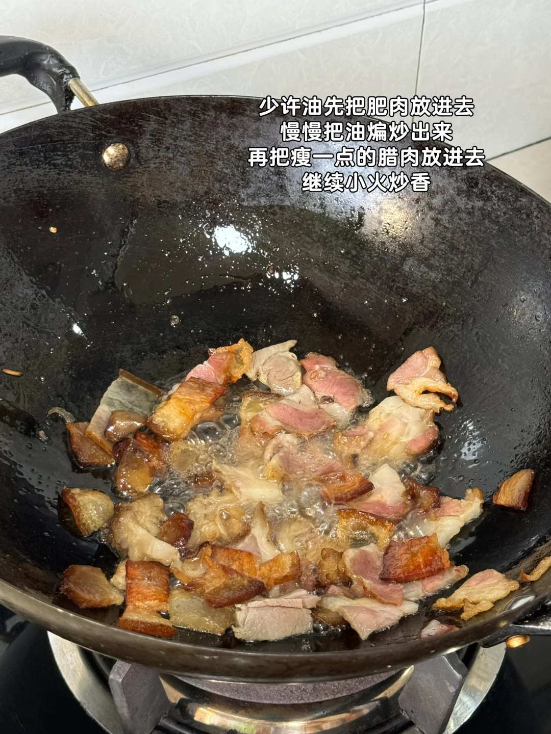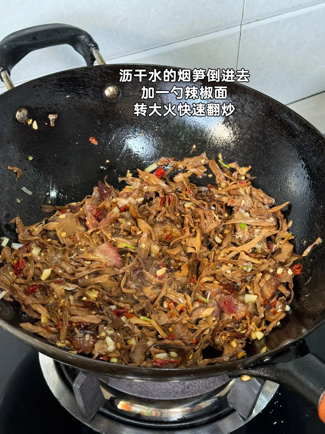 1. 腊肉切小丁大蒜生姜切末准备一些葱花段 2. 锅里水烧开烟笋放进去煮个五分钟左右,这样吃起来口感会更软一些 3. 少许油先把肥肉放进去慢慢把油煸炒出来再把瘦一点的腊肉放进去继续小火炒香 4. 再把大蒜生姜葱白段放进去喜欢吃辣的建议多放点干辣椒会更香 5. 沥干水的烟笋倒进去加一勺辣椒面转大火快速翻炒 6. 一勺生抽,一勺蚝油一丢丢糖提鲜最后放入适量盐出锅前放入多一点的葱花段 7. 超级下饭的一道菜就可以出锅啦