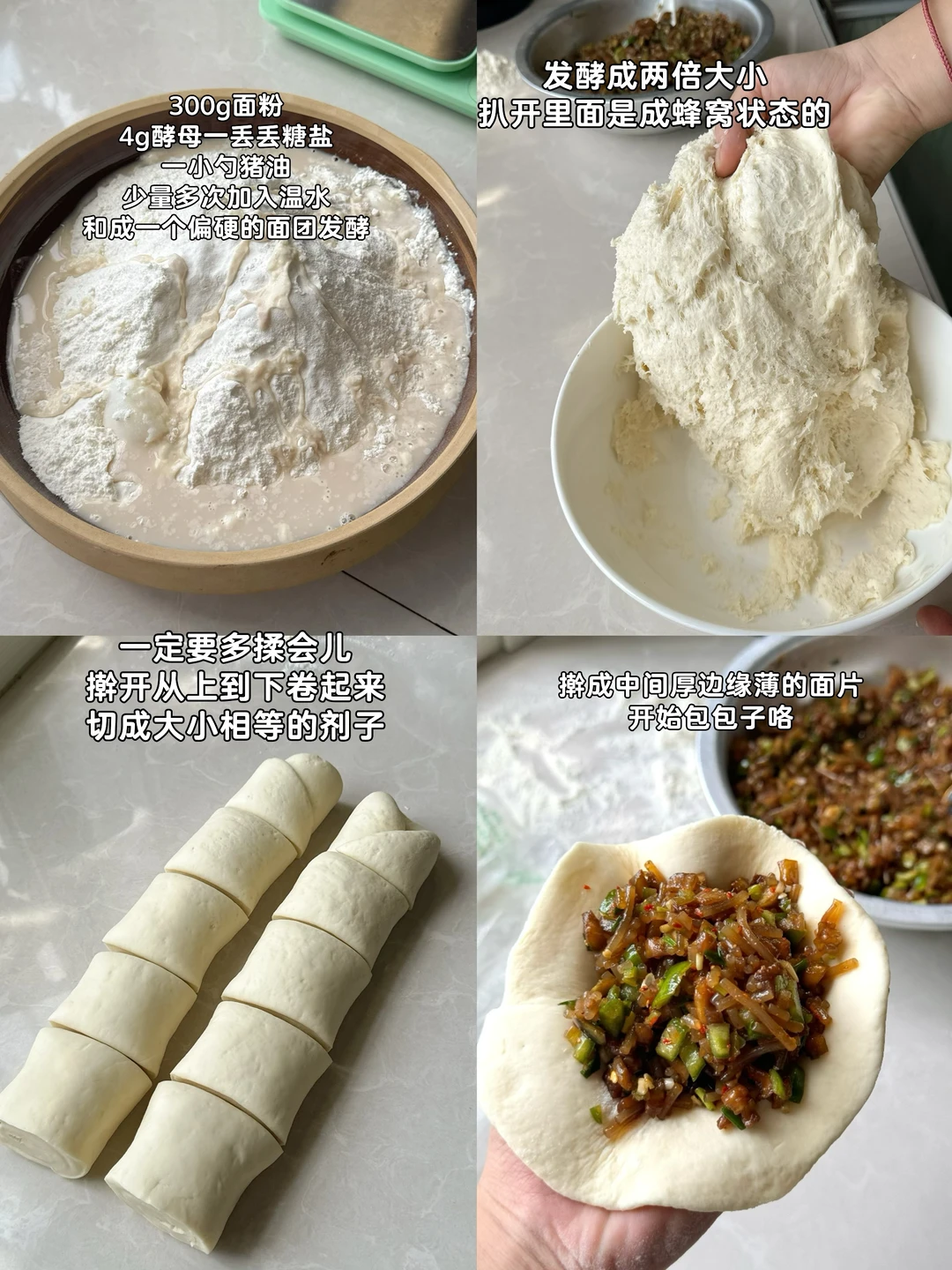 5. 300g面粉4g酵母一丢丢糖盐一小勺猪油少量多次加入温水和成一个偏硬的面团发酵