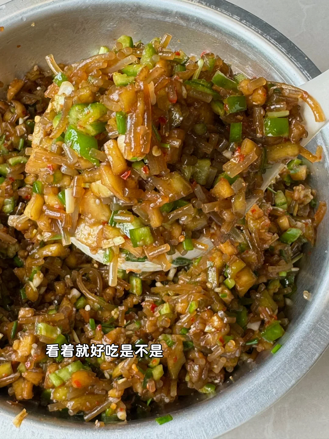 4. 茄子腌出来很多水用手挤掉不要,再放入到一个盆子里,粉丝青椒碎也倒进去多一点的葱花段一丢丢十三香少许糖,一勺蚝油再放一丢丢辣椒面,把烧热的油淋上去,最后放一些白芝麻适量鸡粉和盐调味即可