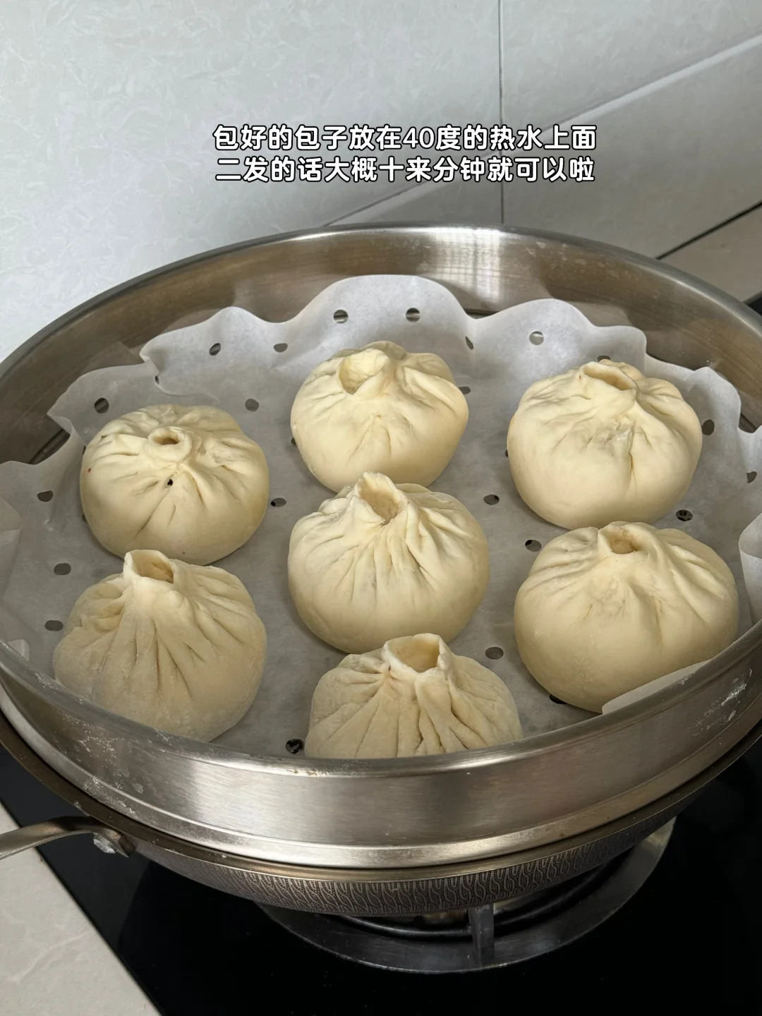 9. 包好的包子放在40度的热水上面二发的话大概十来分钟就可以啦
