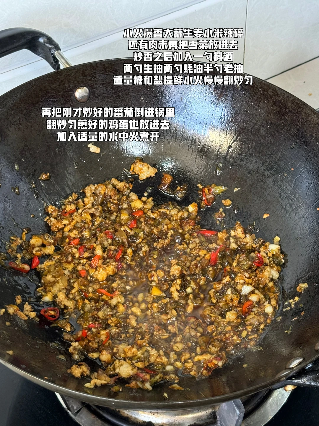 1. 我用的是江西米粉水开以后放入米粉煮至八九成熟就可以了 2. 煮好的米粉捞起来放在凉水里先泡着,不然的话容易粘在一起 3. 今天我用的是这个雪菜绒特别好,很干净,也不会很咸,所以今天这个汤是可以直接喝的 4. 先煎几个荷包蛋等会儿放在米粉汤里吸饱了汤汁哇太美味,好了以后捞起来待用 5. 小火爆香大蒜生姜小米辣碎还有肉末再把雪菜放进去炒香之后加入一勺料酒两勺生抽两勺蚝油半勺老抽适量糖和盐提鲜小火慢慢翻炒匀 6. 再把刚才炒好的番茄倒进锅里翻炒匀煎好的鸡蛋也放进去加入适量的水中火煮开 7. 放入少许鸡粉提味煮好的米粉放进去煮一两分钟就可以了,出锅前可以放入自己喜欢的蔬菜或者是多一点的韭菜段葱段都可以