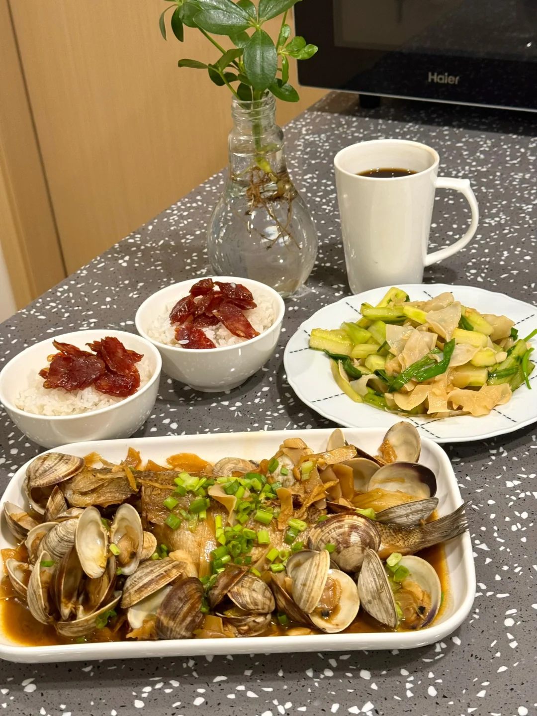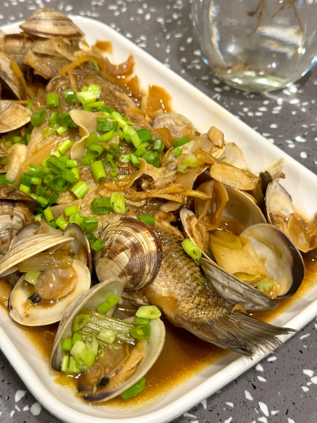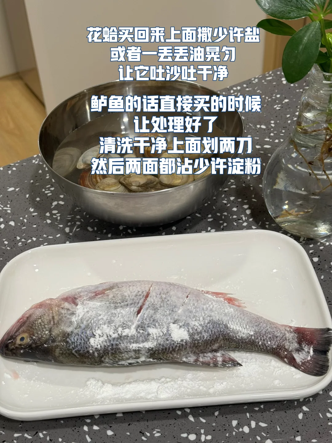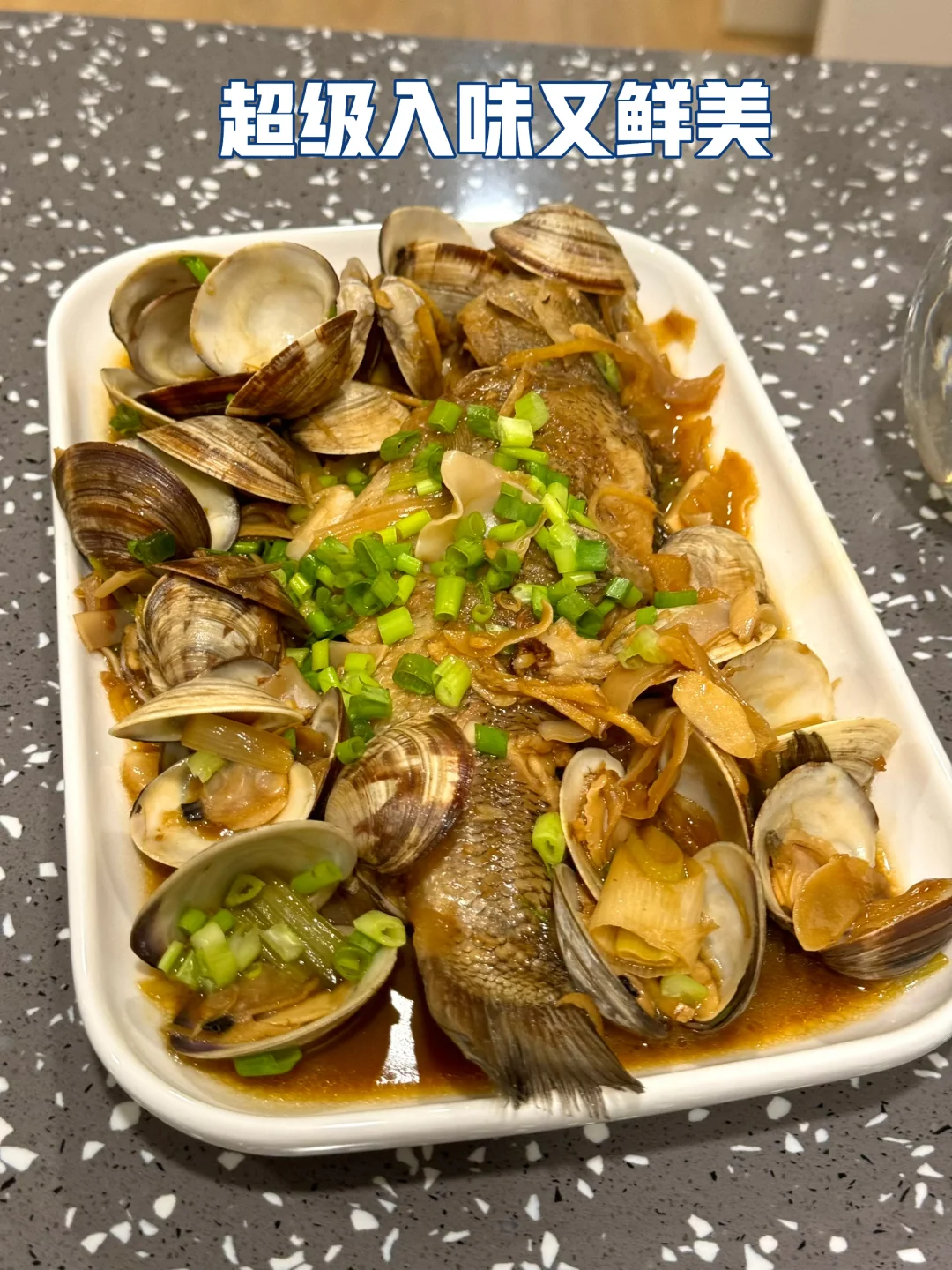 1. 鲈鱼的话直接买的时候让处理好了清洗干净上面划两刀然后两面都沾少许淀粉 花蛤买回来上面撒少许盐或者一丢丢油晃匀让它吐沙吐干净 2. 不粘锅里放入少许油鲈鱼下锅先不要马上去动它先中火煎三四分钟开始定型以后再轻轻晃动一下两面煎至金黄色就可以了 3. 小火爆香大蒜末生姜丝葱白段我还放了一勺黄豆酱小火慢慢炒香 4. 加入一瓶啤酒和适量开水,没有的话全部放水也可以,然后再加入一勺生抽一勺老抽一勺蚝油少许糖 5. 盖上锅盖中小火慢慢煮时不时的用锅铲淋一点汤在鱼身上面汤汁剩三分之二左右的时候把花蛤放进去,加入适量盐鸡粉调味继续煮 6. 汤汁不用收的太干,最后撒葱花出锅即可