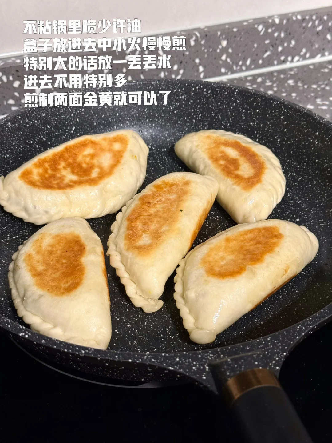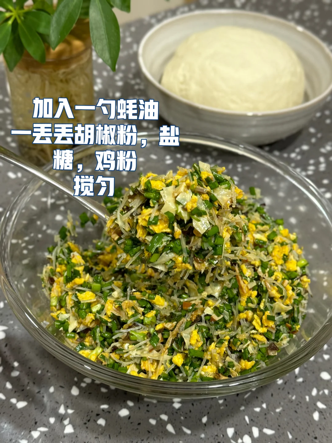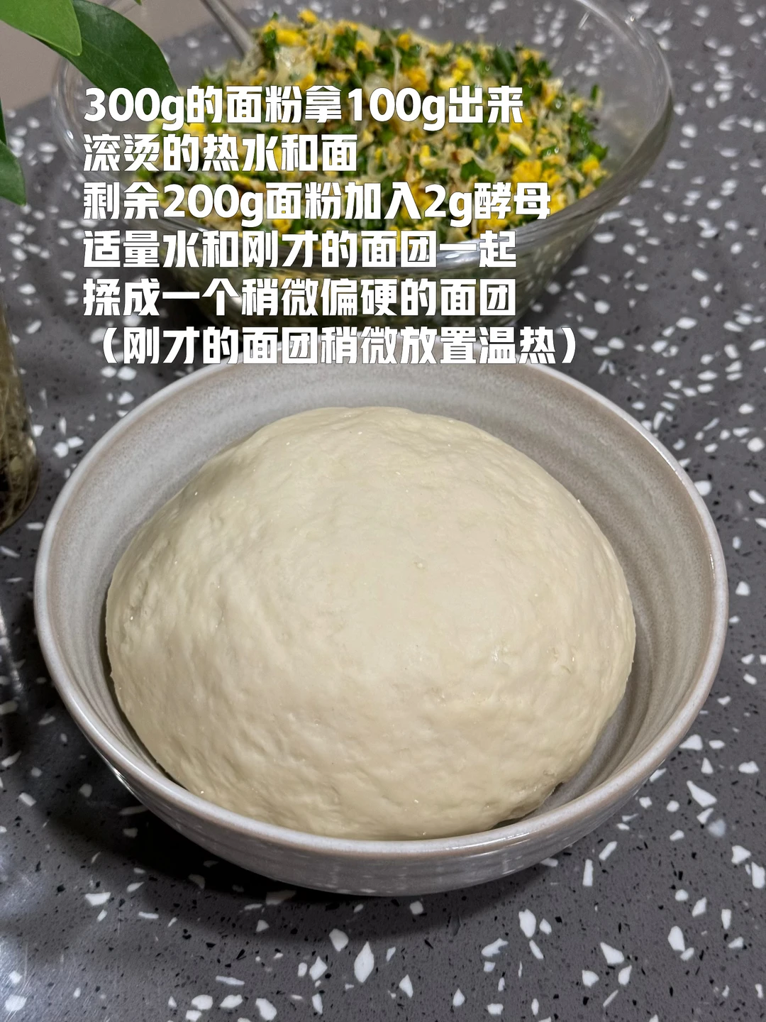 1: 韭菜切好放一点香油搅匀这样不会出水 还放了粉丝鸡蛋木耳香干看自己喜欢放吧 2: 加入一勺蚝油一丢丢胡椒粉,盐糖,鸡粉 搅匀 3: 300g的面粉拿100g出来滚烫的热水和面 剩余200g面粉加入2g酵母适量水和刚才的面团一起揉成一个稍微偏硬的面团(刚才的面团稍微放置温热) 4: 发酵30分钟左右就可以这个不需要太严格只是为了口感更好,分隔成大小相等的剂子 5: 不粘锅里喷少许油盒子放进去中小火慢慢煎,特别大的话放一丢丢水进去不用特别多,煎制两面金黄就可以了