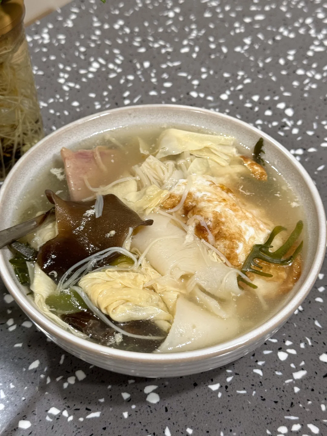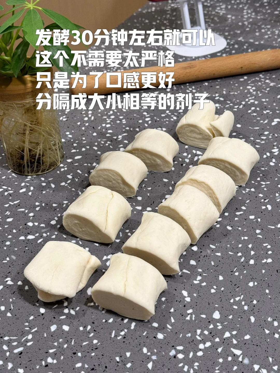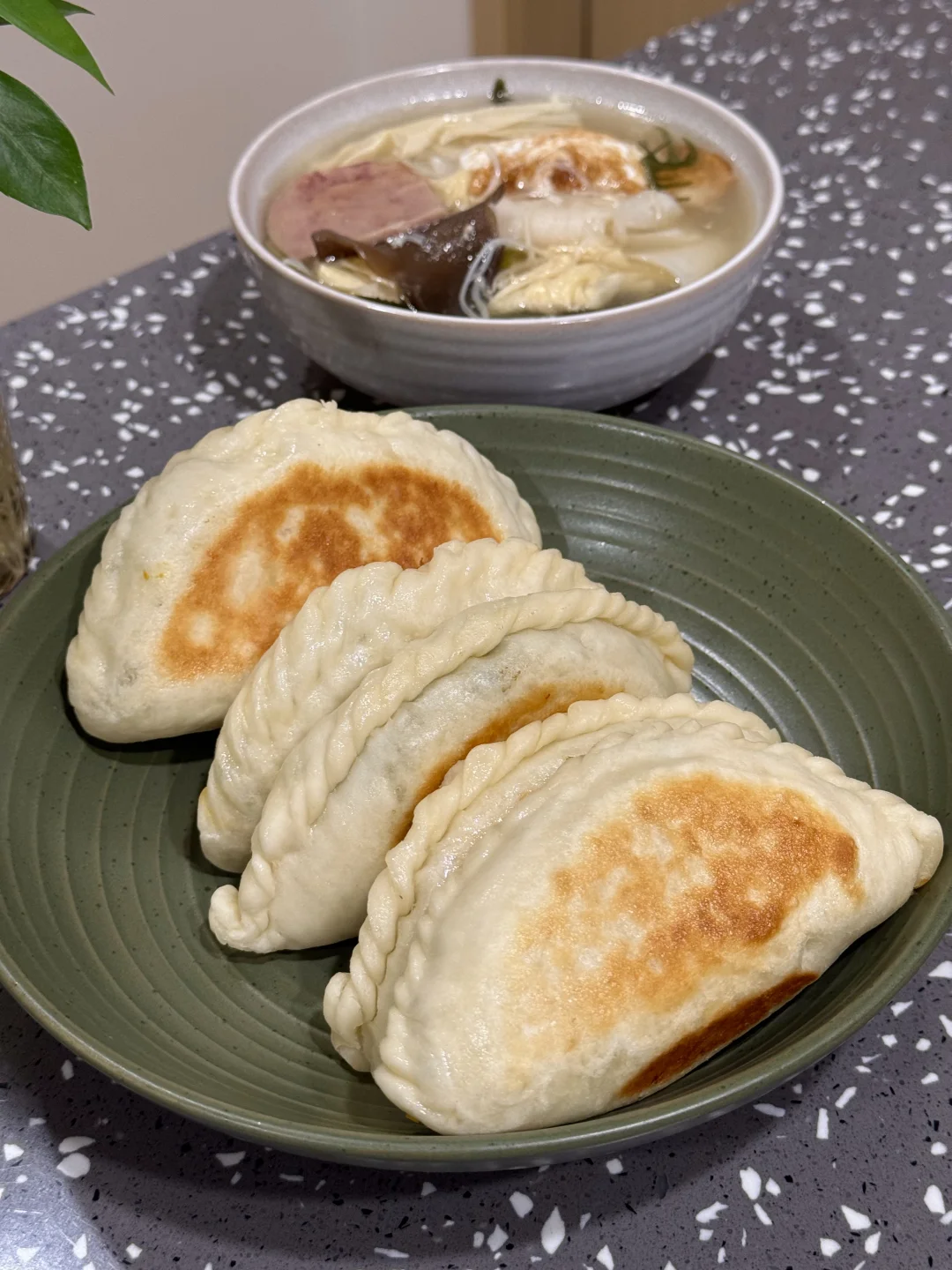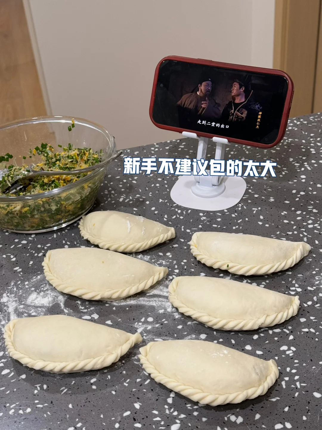 1: 韭菜切好放一点香油搅匀这样不会出水 还放了粉丝鸡蛋木耳香干看自己喜欢放吧 2: 加入一勺蚝油一丢丢胡椒粉,盐糖,鸡粉 搅匀 3: 300g的面粉拿100g出来滚烫的热水和面 剩余200g面粉加入2g酵母适量水和刚才的面团一起揉成一个稍微偏硬的面团(刚才的面团稍微放置温热) 4: 发酵30分钟左右就可以这个不需要太严格只是为了口感更好,分隔成大小相等的剂子 5: 不粘锅里喷少许油盒子放进去中小火慢慢煎,特别大的话放一丢丢水进去不用特别多,煎制两面金黄就可以了