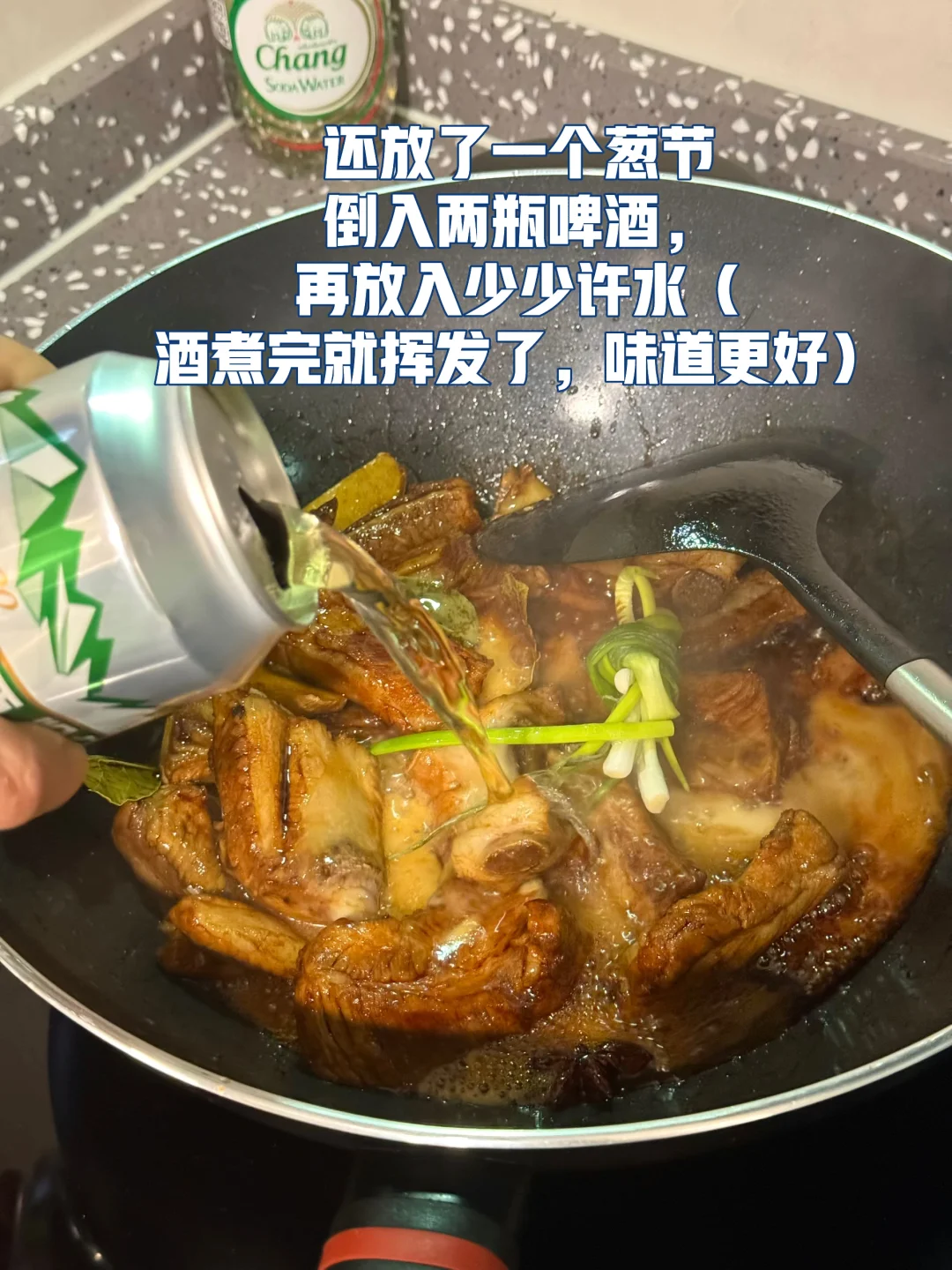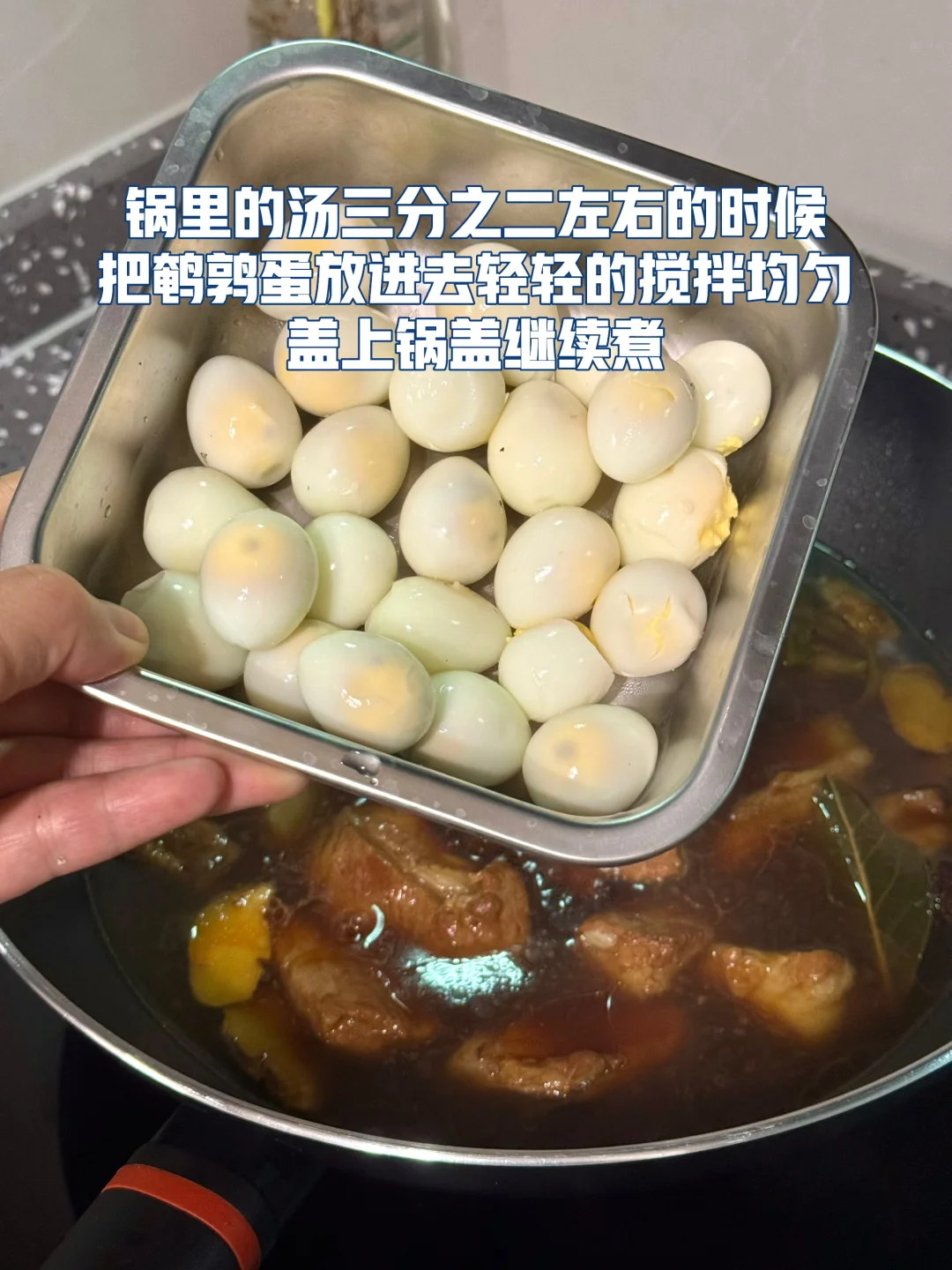 1. 排骨切成均匀的段冷水入锅加入生姜料酒葱节煮开以后温水冲进浮沫沥干水,待用 2. 冷油入锅放入冰糖用锅铲慢慢不停的碾压直至出糖色 3. 沥干水的排骨倒进去,快速翻炒裹上糖色加入一勺料酒一勺生抽半勺老抽一勺蚝油少许生姜片两片香叶 4. 还放了一个葱节,倒入两瓶啤酒,再放入少少许水(酒煮完就挥发了,味道更好) 5. 盖上锅盖中小火慢慢煮吧! 6. 鹌鹑蛋冷水入锅煮熟,然后冷水里泡一下剥壳 7. 锅里的汤三分之二左右的时候把鹌鹑蛋放进去轻轻的搅拌均匀盖上锅盖继续煮 8. 放入少许盐鸡粉调味最后三分之一汤汁收汁的时候记得用大火锅铲不停的翻炒