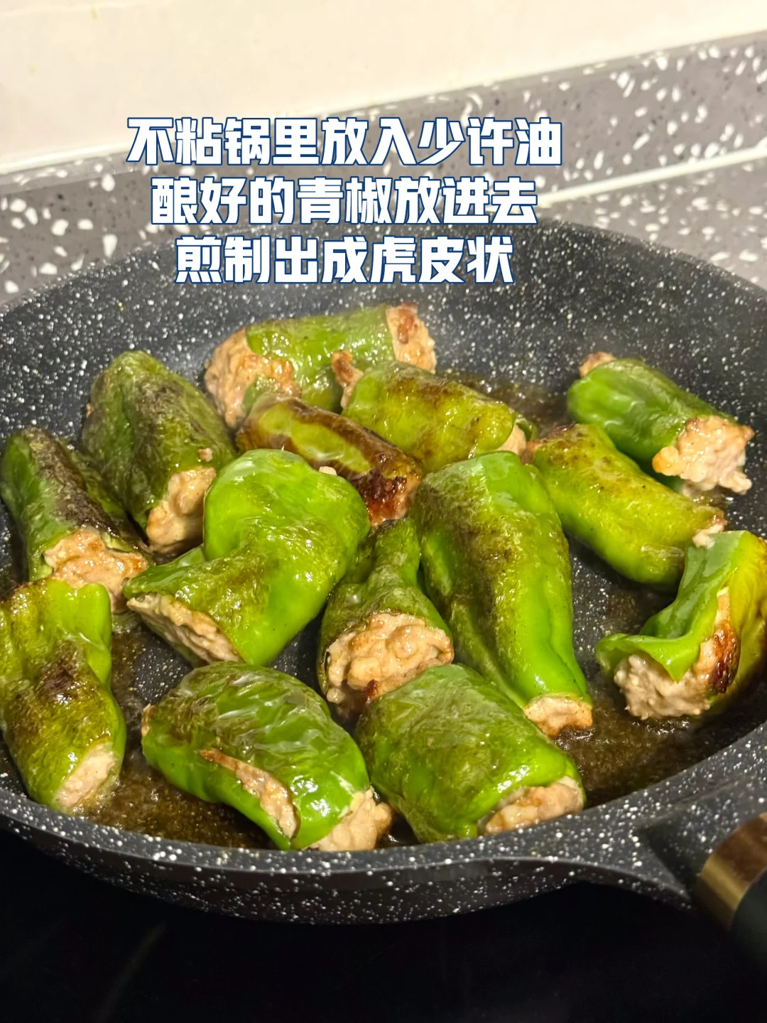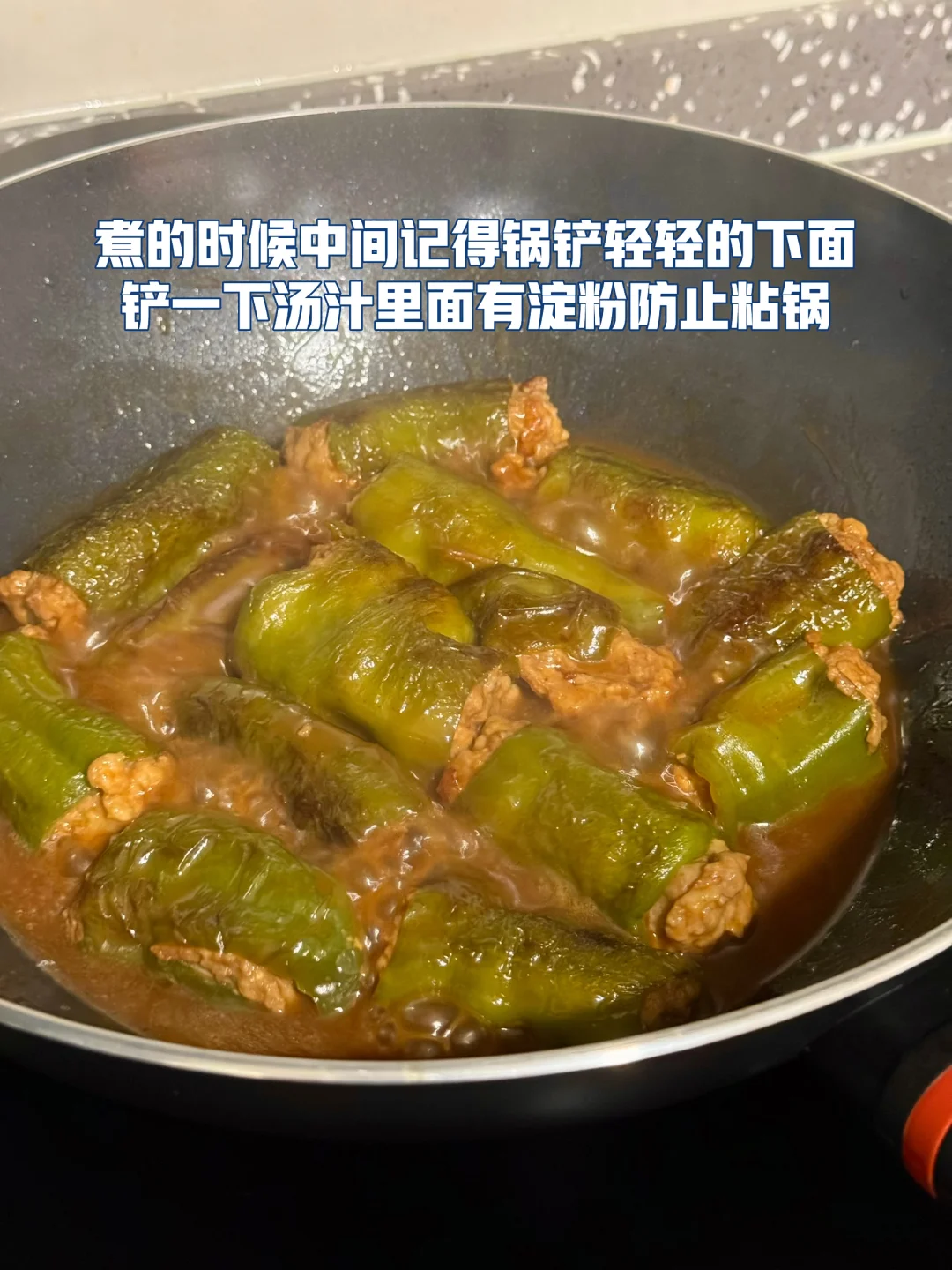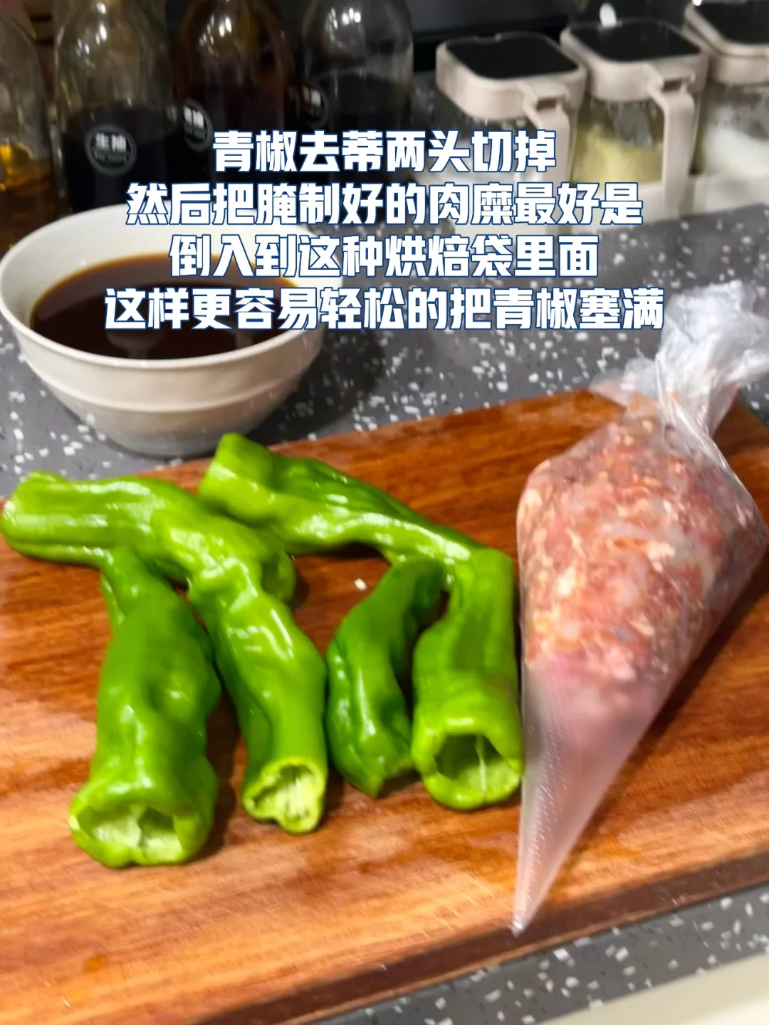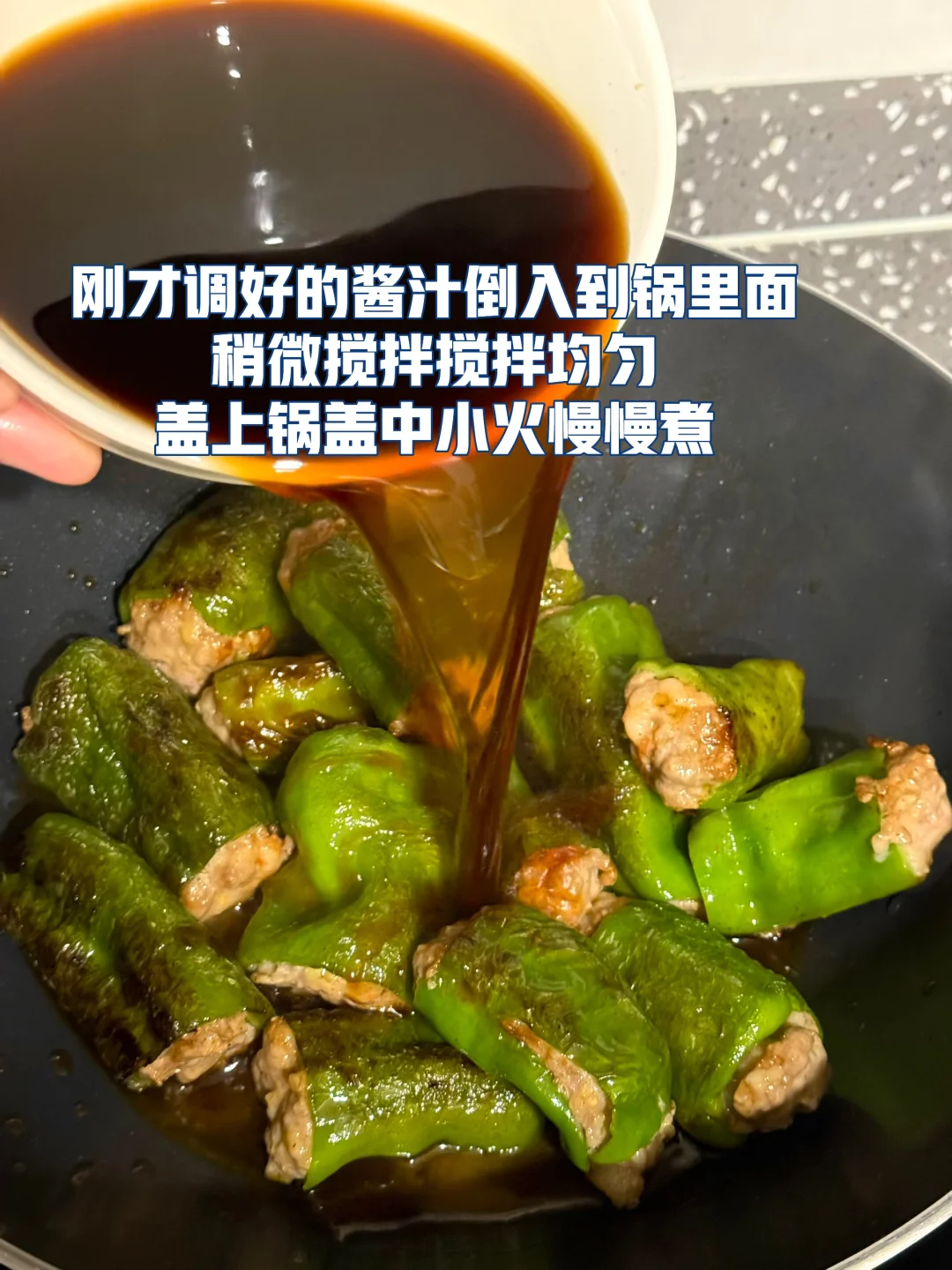 青椒酿肉做法 1. 这里可以选择用带一点肥肉的五花肉或者是前腿肉会更好,全部瘦的的话可能会有点柴,所以我加了一点虾滑进去你们可以试试口感会更Q 2. 剁好的肉糜里面加入一勺生抽,四分之一勺老抽,一勺蚝油一丢丢糖鸡粉,胡椒粉 3. 再加入切好的生姜末一丢丢生粉用手抓匀 4. 抓匀之后放冰箱冷藏腌制一会会更入味 5. 青椒去蒂两头切掉然后把腌制好的肉糜最好是倒入到这种烘焙袋里面这样更容易轻松的把青椒塞满 6. 塞完肉发现青椒太大了,不容易入味,所以我就把它切成两截,你们根据自己的情况来吧! 7. 提前把料汁调好:生抽一勺半,老抽半勺,醋半勺,蚝油一勺,淀粉一勺,一丢丢鸡粉,加小半碗的水搅拌均匀 8. 刚才调好的酱汁倒入到锅里面稍微搅拌搅拌均匀盖上锅盖中小火慢慢煮 9. 煮的时候中间记得锅铲轻轻的下面铲一下汤匙里面有淀粉防止粘锅 10. 喜欢汤汁泡饭的话可以留点汤别收的太干因为这个汤很入味很好吃的