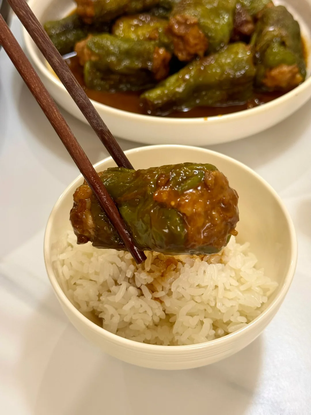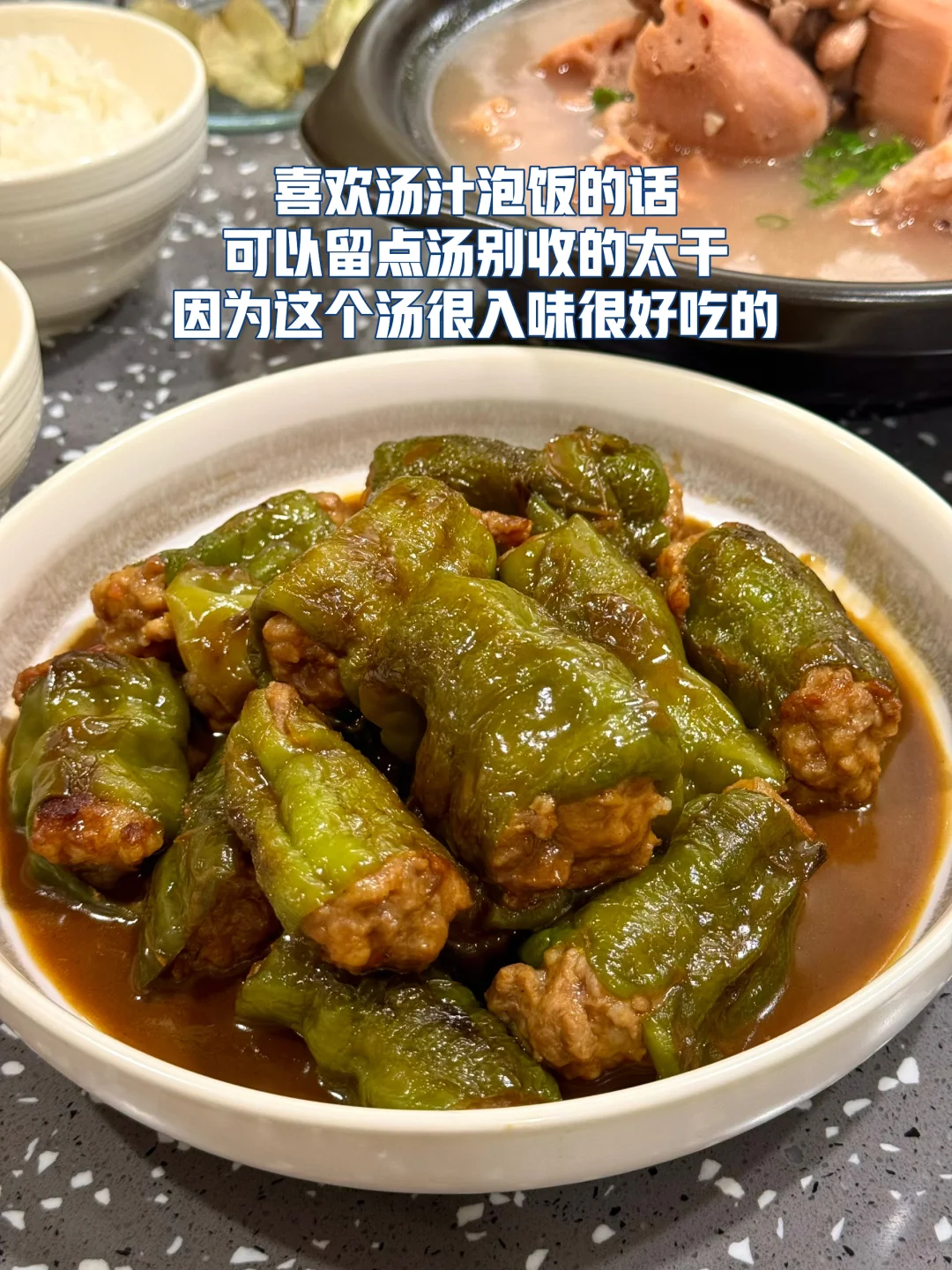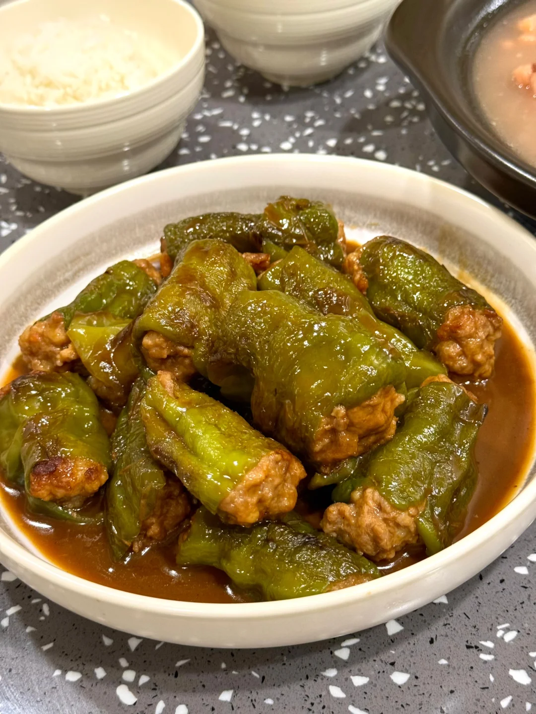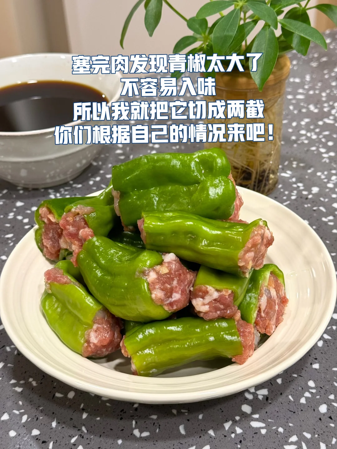 青椒酿肉做法 1. 这里可以选择用带一点肥肉的五花肉或者是前腿肉会更好,全部瘦的的话可能会有点柴,所以我加了一点虾滑进去你们可以试试口感会更Q 2. 剁好的肉糜里面加入一勺生抽,四分之一勺老抽,一勺蚝油一丢丢糖鸡粉,胡椒粉 3. 再加入切好的生姜末一丢丢生粉用手抓匀 4. 抓匀之后放冰箱冷藏腌制一会会更入味 5. 青椒去蒂两头切掉然后把腌制好的肉糜最好是倒入到这种烘焙袋里面这样更容易轻松的把青椒塞满 6. 塞完肉发现青椒太大了,不容易入味,所以我就把它切成两截,你们根据自己的情况来吧! 7. 提前把料汁调好:生抽一勺半,老抽半勺,醋半勺,蚝油一勺,淀粉一勺,一丢丢鸡粉,加小半碗的水搅拌均匀 8. 刚才调好的酱汁倒入到锅里面稍微搅拌搅拌均匀盖上锅盖中小火慢慢煮 9. 煮的时候中间记得锅铲轻轻的下面铲一下汤匙里面有淀粉防止粘锅 10. 喜欢汤汁泡饭的话可以留点汤别收的太干因为这个汤很入味很好吃的