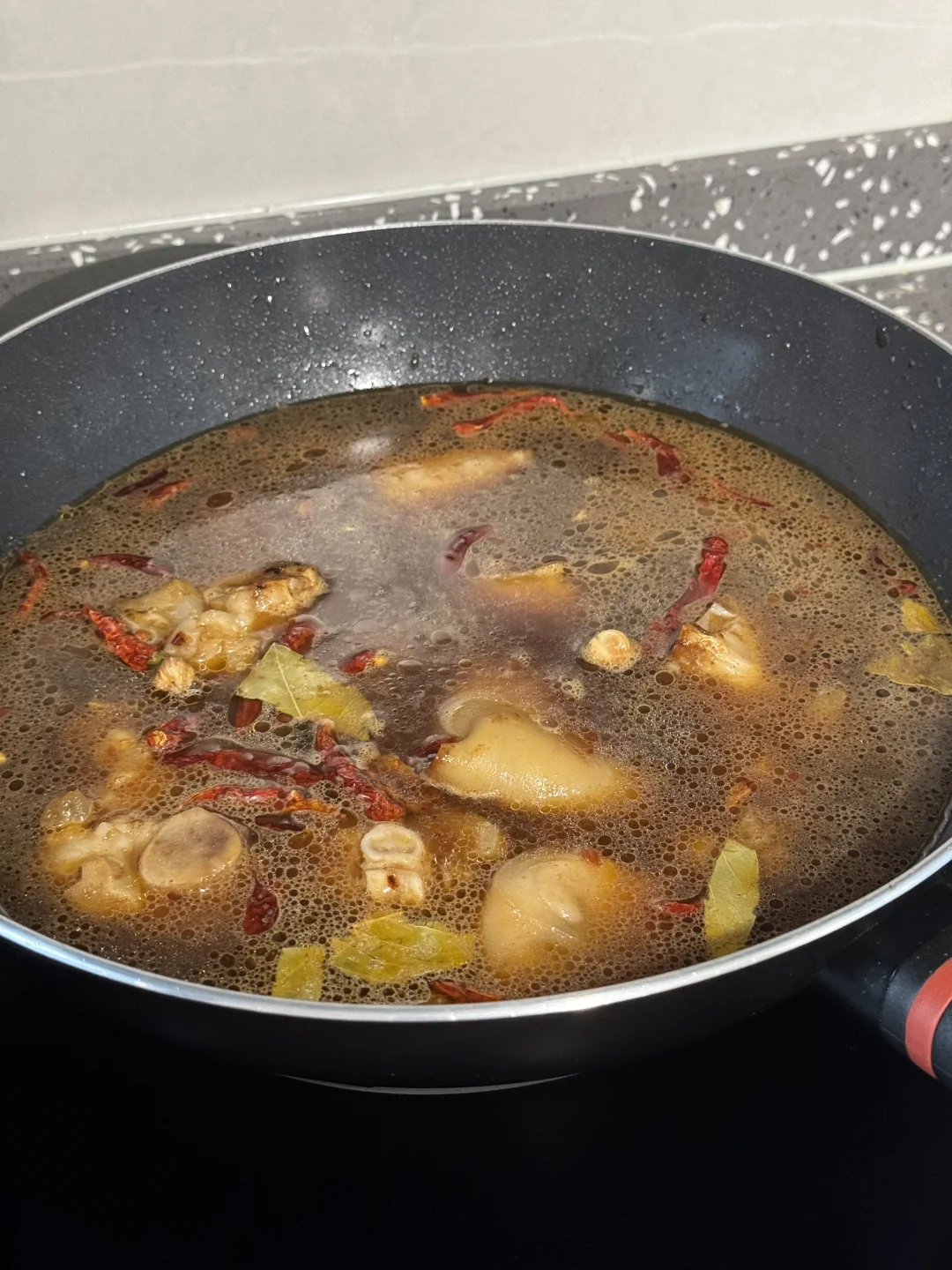 2: 冷锅入油加入少许冰糖中小火慢慢煸炒至糖色出来,猪蹄放进去快速翻炒裹糖色加入一勺料酒炒干水分,再加入一勺豆瓣酱一勺黄豆酱八角香叶生姜大蒜干辣椒,小火炒出红油,一勺生抽拌半勺老抽一勺蚝油加入两瓶啤酒,适量水