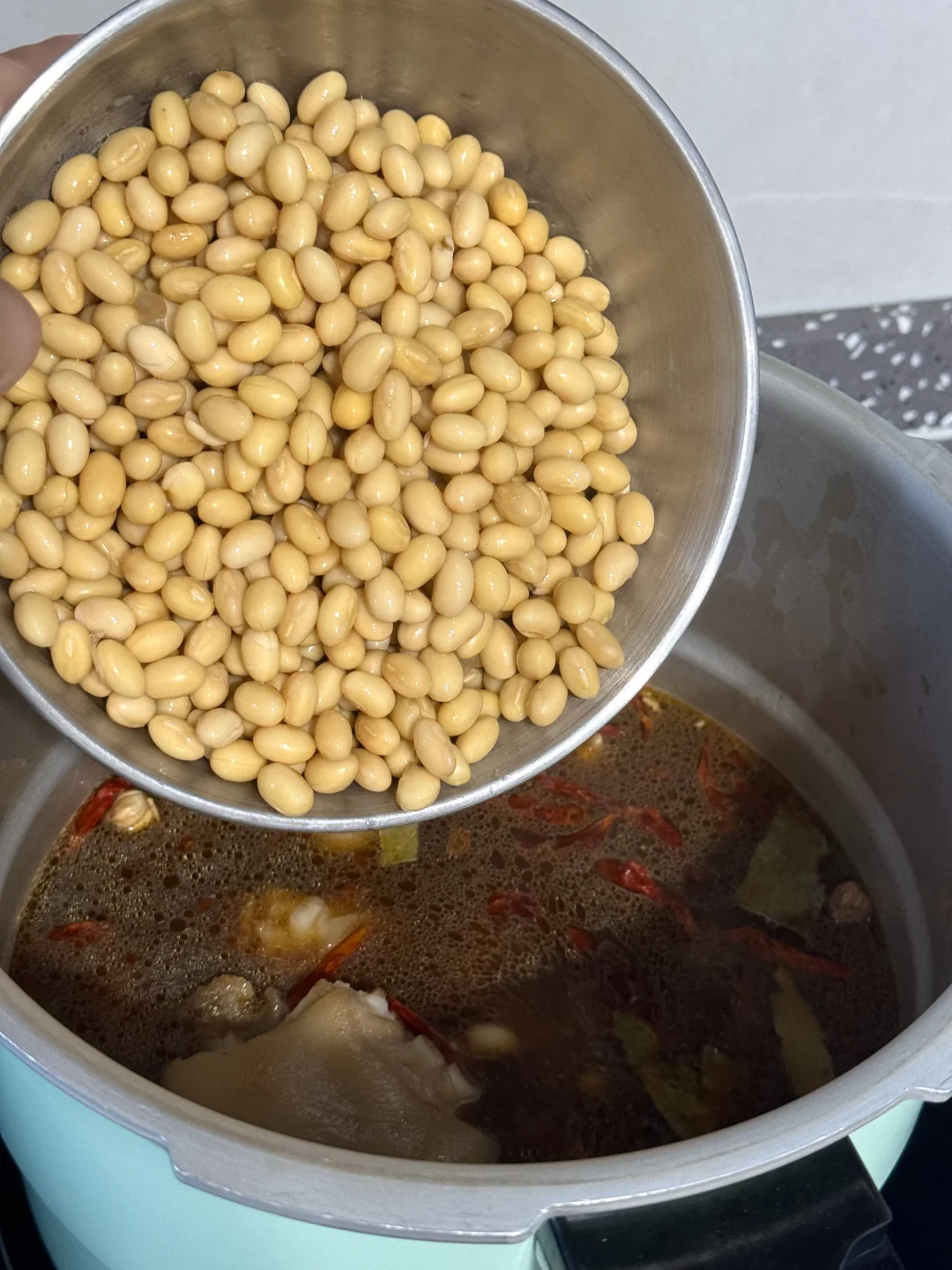 3: 如果比较着急的亲可以将提前浸泡好的黄豆倒入到高压锅一起压个八分钟熄火拿出来倒入到炒锅里,然后再中火慢慢收汁就可以了