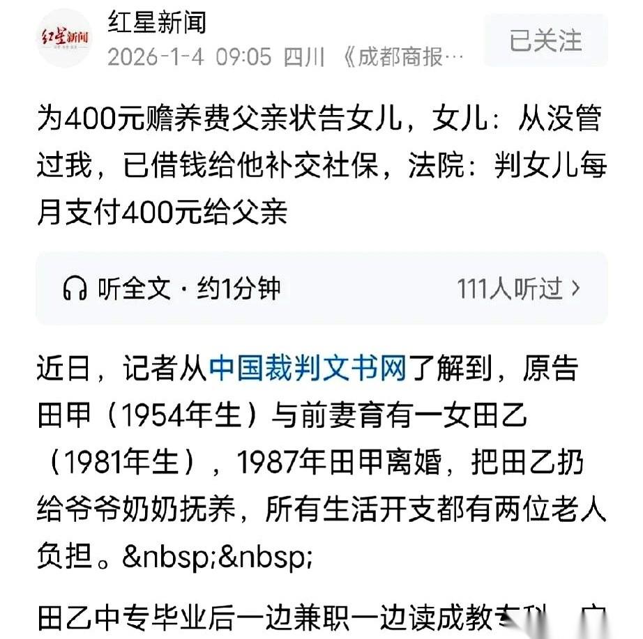 我今天真算是开了眼了。 一个当爹的,把6岁的亲闺女扔给爷爷奶奶,从此消失。不给一分钱,不管死活,连女儿结婚他都没露过面。 结果呢?等他老了,想起来了。 不是想补偿,是来要钱。 女儿心软,自己日子过得紧巴巴,还是陆陆续续给了。 他变本加厉,闹着要女儿给他买养老保险。 女儿没办法,跟亲戚朋友借了3万5,给他买了。 这下总该消停了吧? 他退休了,每个月领着1500的养老金,这笔钱,还是女儿借债给他换来的。 他转头就把女儿告上法庭,说钱不够花,要求女儿每个月再给他400块。 真的,看到这我拳头都硬了。 这已经不是孝顺不孝顺的问题了。 这就是一个无底洞。 你用血汗,用眼泪,用委屈,都填不满的。 最让人憋屈的是什么? 法院判他赢了。 说法律上,赡养是义务,和他当年有没有尽抚养责任,是两码事。 我懂法律的逻辑。 但我心疼那个女儿。 她这辈子,都在为那个“父亲”的称谓买单。 小时候,她用童年买单。 长大了,她用自己的血汗钱买单。 最后,她还得用法律判决,用每个月400块,去为这个早已名存实亡的关系,继续买单。 有些血缘关系,真的不是纽带。 是枷锁。