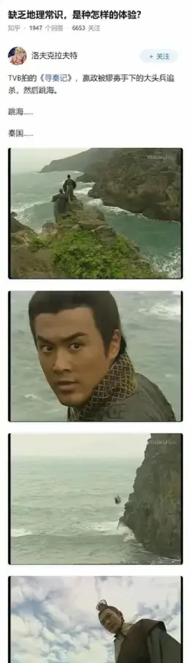 嬴政被追得无路可走,镜头一甩就跳海。 小时候看得手心冒汗,现在重刷直接笑出声:咸阳离海八百里,这哪是逃命,这是跨省游泳。 TVB当年穷得只剩创意,把悬崖改成海岸,一条蓝幕拍到底,全靠林峰撕心裂肺的演技把漏洞糊过去。 二十多年过去,大家翻出地图较真,反倒把这口童年滤镜擦得更亮。 魔改归魔改,好看是真好看。 穷有穷的拍法,想象力永远不省钱。