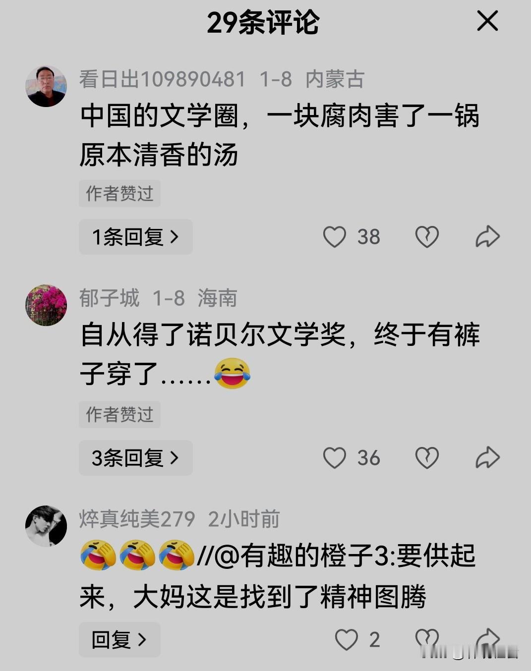 网上流传:1月8日,莫言走进天津大学开展学术交流活动,校园内遇到了一群喜欢莫言作品的大妈,即刻为莫言抓拍。 北方的冬季天气寒冷,再加上小时候穷怕的原因,莫言穿得很厚实,显得特别暖和!莫言脖子上围了一条长长的围巾,大棉袄把他的屁股也包上了。 网友评论区调侃:自从得了诺贝尔文学奖,终于有裤子穿了……[笑哭]