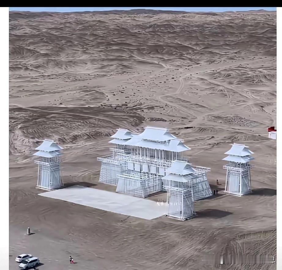 戈壁滩上,荒凉一片,上万根钢管搭建而成的“门楼”矗立在这里。 是模仿古代城门的设计?设计者的本意是什么呢?现在的效果似乎并没有达到预期的目的,反而显得阴森可怖,给人一种不寒而栗的感觉。这究竟是为什么呢? 要说美吧,也不太像古代城门的样子,更像是工地上的脚手架,或者说是竖立在戈壁滩上的墓碑。周围一片荒凉,更显得恐怖。耗费了这么多的人力物力财力,这么大资源搭建而成,最终给人的感觉却是不要靠近,一靠近就有危险。难道我们的审美观念变了吗?