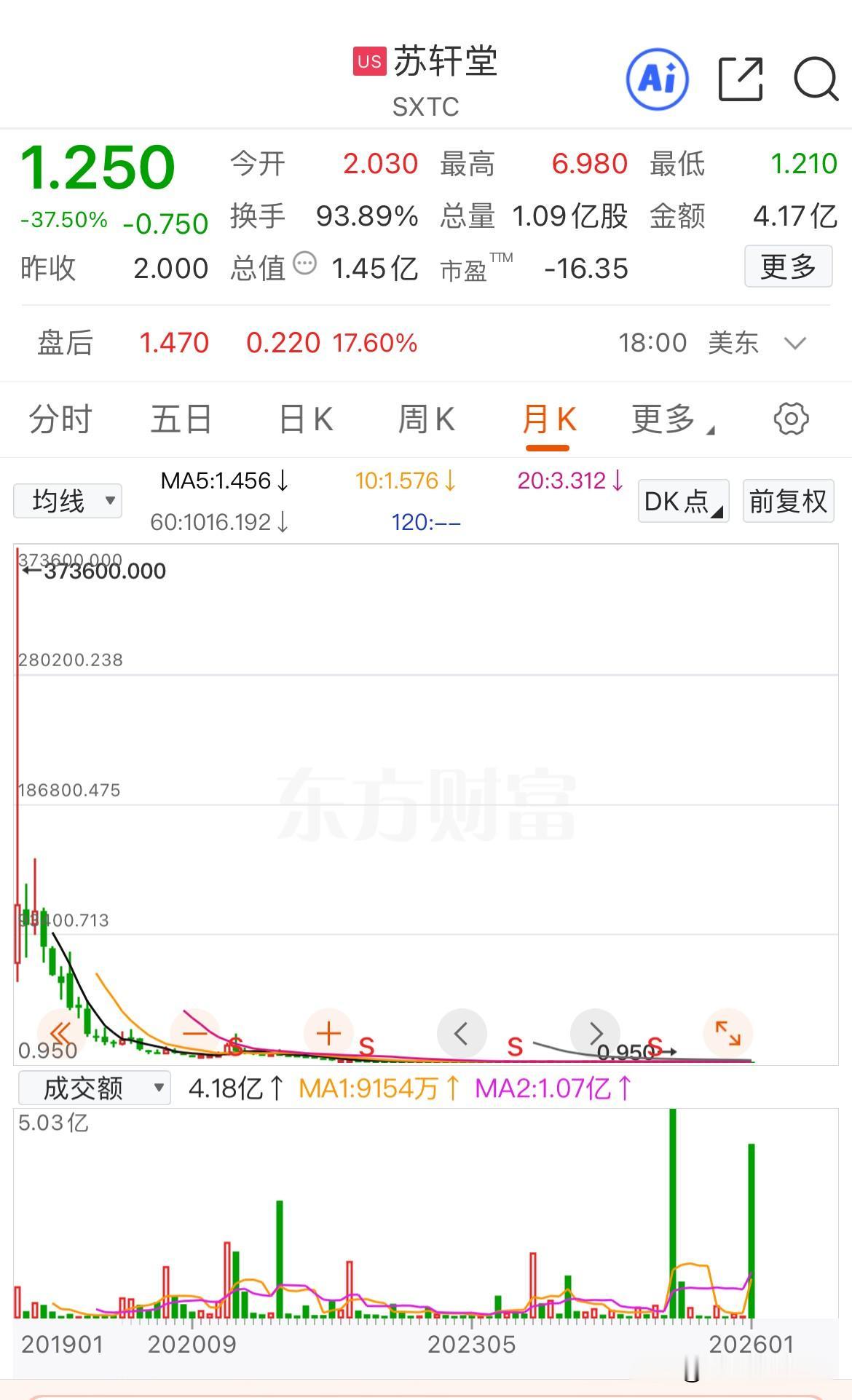 美股昨晚最惨的票诞生了,从最高涨197%到最低跌37.5%,这是真正的从天堂到地狱! 这是一家在美股上市的国内创新型的中药制药公司,早在2019年就上市了,不过也算是上市即巅峰的典型,从最高的37万美元一股跌到了现在的1美元左右,不过近期似乎有启动的迹象,连续大阳线上涨。 在头一天大涨18%的情况下,该票昨晚小幅高开1.5%,随后一路拉升至涨142%并停牌!复牌后在大幅回落后再次大幅上涨并最高涨至190%,但没想到随后急转直下,仅40分钟涨幅就仅剩28.5%! 期间该票又因为短期跌幅过大而面临两次停牌,出人意料的是在第二次停牌后该票却选择了再次上攻,直至上涨到了197%被停牌! 没想到这次停牌再次成为了转折点,其后该票大幅跳水,随后不断震荡走低直至翻绿,最终收跌37.5%! 如果贪心不卖的话,仅这一晚上就会经历从涨3倍又到本金几乎腰斩的地步,这是真正的从天堂到地狱!