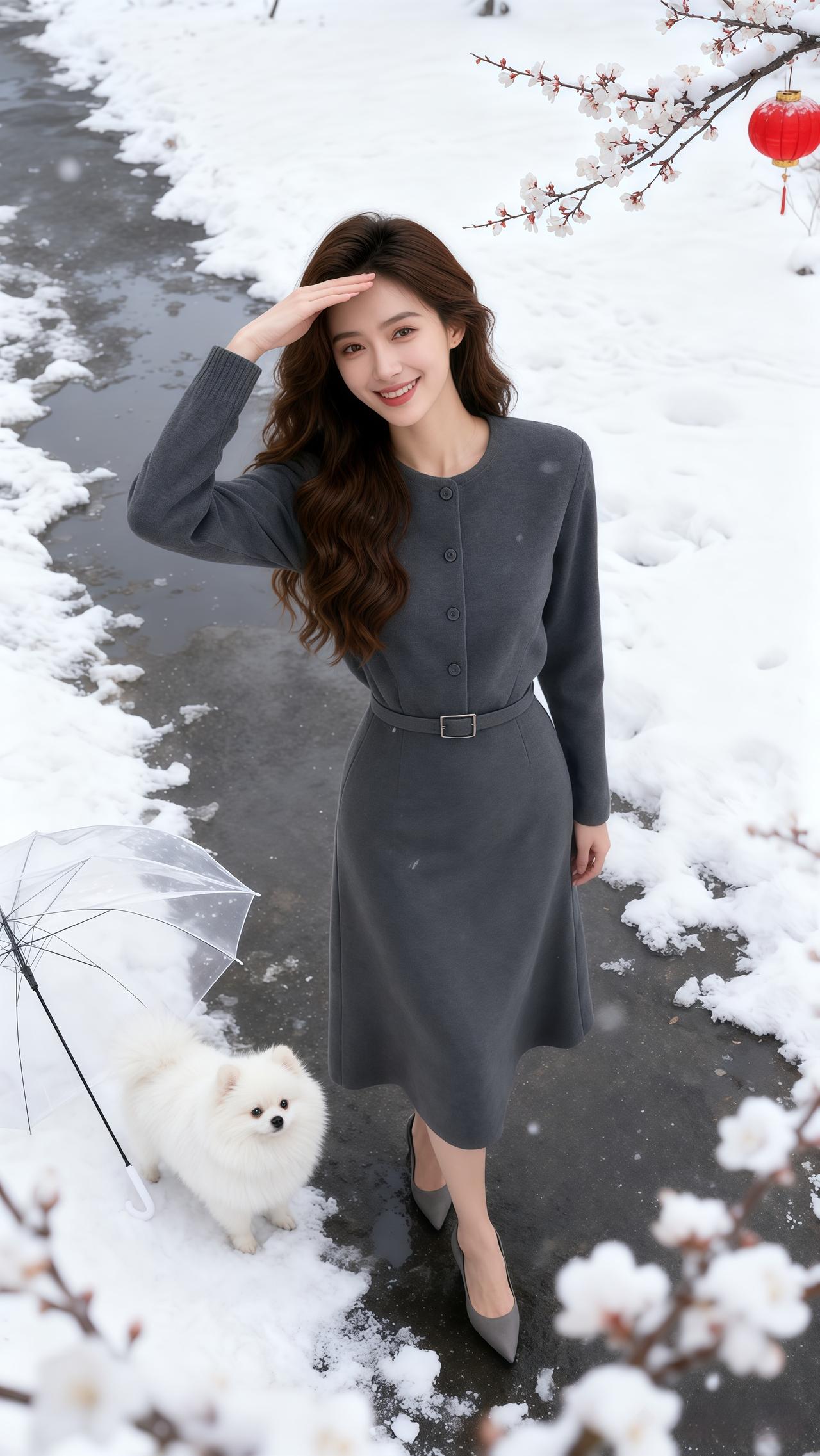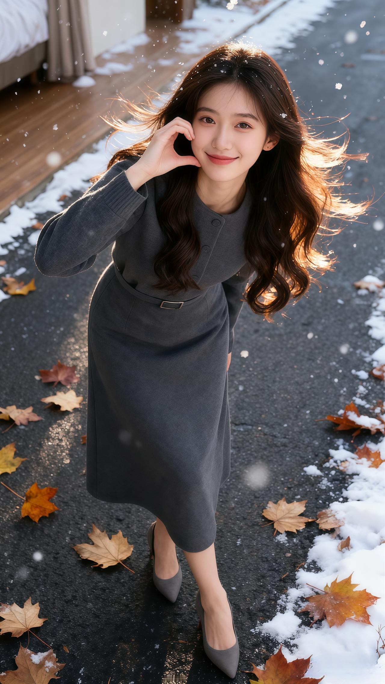 冬日森林中的时尚穿搭,毛绒外套与黑色皮裤的完美结合,尽显优雅与温暖。