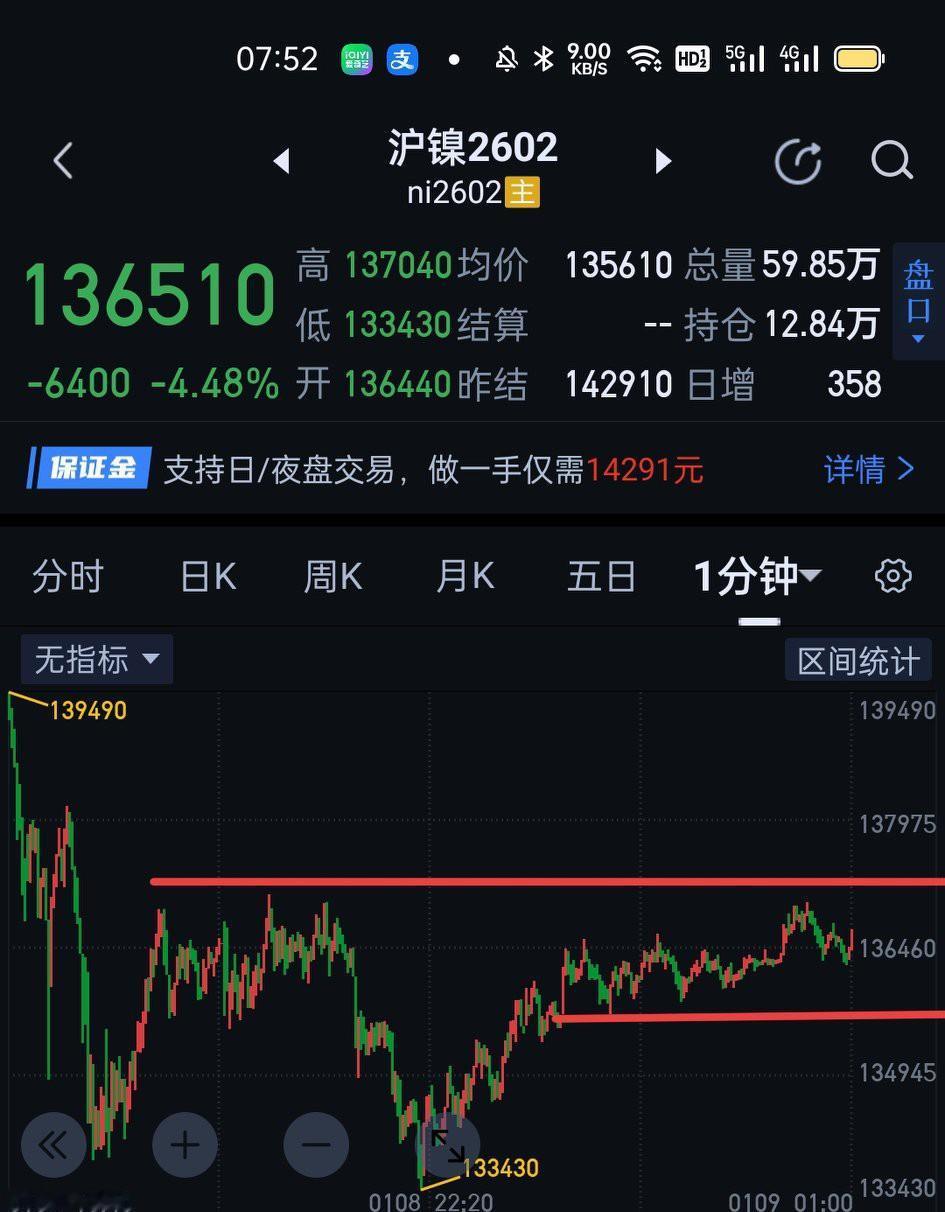 沪镍2602,目前第二个一分钟中枢构建中,如果日内走出向下离开段的背驰,可以试着做多,看三十分钟一笔上开始,注意一定要设好止损。如果离开段背驰后买入,反弹如果进入133800,可把133800设为止盈位,然后继续跟随上涨。细节上,日内如果137040站稳,可能就没有破坏133430的离开段,可用二买点去把握入场机会。如果盘中有效跌破135580,就可以期待133430下去找买点了。