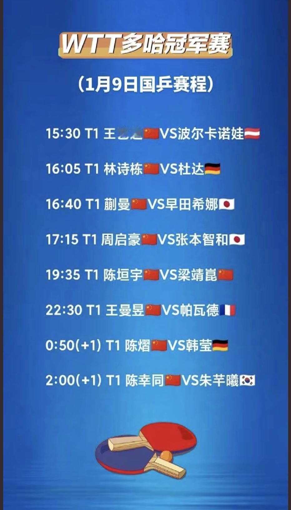 2026年WTT多哈冠军赛1月9日进入1/8决赛阶段,国乒4男5女共9名选手登场作战。以下是具体赛程 : 15:30 王艺迪VS波尔卡诺娃 16:05 林诗栋VS杜达 16:40 蒯曼VS早田希娜 17:15 周启豪VS张本智和 19:35 梁靖昆VS陈垣宇 22:30 王曼昱VS帕瓦德 次日00:50 陈熠VS韩莹 次日02:00 陈幸同VS朱芊曦