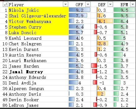 你掘穆雷的全明星入选前景很难说 球迷选票前五必进,剩下的7人由教练投票选出。华子、詹里之一、杜申之一必进。这样就3个了,还剩4个名额。 竞争者包括10人(根据选票/战绩/数据): 非争冠队大当家:阿福迪亚,AD,哈登/伦纳德,布克,马尔卡宁 争冠二当家:杜申剩下那个,穆雷,切特 流量队三当家:詹里剩下那个 以上所有西部全明星候选人的epm见图二。