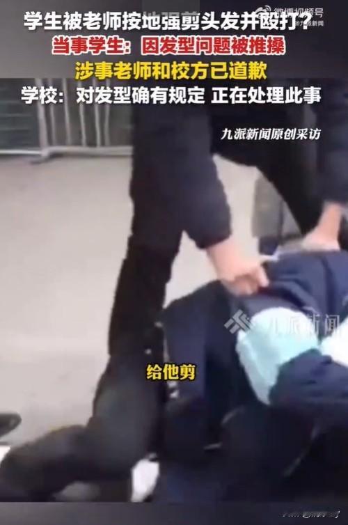 学生发型不规范!老师把学生强行按在地上剪发! 有网友说赞成学校的做法,没有规矩不成方圆!连规矩都不能遵守的学生,还能有什么好的人品! 也有网友说,强行把学生按倒在地有点像地主批斗的味道,具有一定的侮辱性!学校的初衷没有毛病,但操纵太过于野蛮了! 我家孩子上初中的时候,老师会定期检查孩子的头发和指甲,如果孩子头发过长,没有达到学校的要求,老师会给家长打电话把孩子接走,剪完头发再送到学校! 上高中的时候,老师更严厉,周末会把学校要求的发型发到班级群里,让学生按着那个发型剪,如果你的孩子没有按照规定剪发周一就不要进教室了! 是学生就应该遵守学校的规定!但是老师这样的做法确实让人很难理解,方式有点太粗暴了容易给自己招来麻烦!