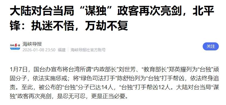 就在刚刚,赖清德正式回应,1月8日,针对大陆国台办宣布“台独顽固分子” 与 “帮凶” 清单,赖清德告诉在场记者:“身为‘总统’,对于任何一个被中国进行跨境镇压的人民感到骄傲。”   2026年1月8日,面对大陆方面依法将刘世芳、郑英耀等人列入“台独”顽固分子清单的惩戒措施,赖清德非但没有丝毫反思,反而宣称对这些被“跨境镇压”的人民感到“骄傲”。   这种言论的背后,是对历史的无知,对现实的扭曲,更是对台湾民众福祉的极端不负责任,清单所指向的,从来不是广大的台湾同胞,而是那些处心积虑推动分裂、破坏两岸关系和平发展的顽固分子。   刘世芳、郑英耀等人之所以被点名,是因为他们宣扬分裂谬论、打压两岸正常交流、主导编纂“去中国化”的“台独”教材等恶劣行径,这些行为桩桩件件都在侵蚀两岸和平的根基,将台湾引向危险的深渊。   大陆方面采取的惩戒措施,是依据《反分裂国家法》等法律进行的精准打击,旨在惩前毖后,依法追责,是维护国家主权和领土完整的必要正义之举。   将这种捍卫国家统一的合法行动歪曲为“跨境镇压”,并为之“骄傲”,无异于将引火烧身视作荣耀,其逻辑之错乱,令人瞠目。   更具迷惑性也更显其心虚的,是赖清德搬出的所谓“证据”——日本参议员石平的访台,他试图用一个被中国制裁的外国政客能够入境台湾,来证明“中华民国和中华人民共和国互不隶属”。   石平是一个出生在中国,后因个人政治原因与祖国决裂,并归化日本的政客,他长期在台湾、钓鱼岛等问题上散布谬论,公然干涉中国内政,是典型的反华急先锋。   中国政府对其实施制裁,是维护自身主权的正当反制,一个外国公民能否进入中国的一个地方行政区域,涉及的是出入境管理问题,与国家主权归属是两个截然不同的概念。   赖清德将出入境管理偷换概念为国家主权的分割,这种低劣的政治操弄,恰恰暴露了其在法理和事实上都站不住脚的窘境。   依赖一个外国反华政客的“行为艺术”来为自己的分裂主张背书,这本身就是对所谓“主权独立”的最大讽刺,凸显的不是自信,而是彻头彻尾的投机与依赖。   赖清德的“骄傲”,是一种置于悬崖边缘的盲目自嗨,他所引以为傲的,恰恰是将台湾2300万同胞的安危作为其个人政治野心的赌注。   他所兜售的“互不隶属”的谎言,在14亿多中国人民反“独”促统的坚定意志面前,显得如此苍白无力。   历史已经并将继续证明,任何分裂国家的图谋终将失败,任何与民族大义和历史潮流背道而驰的顽固分子,都将被钉在历史的耻辱柱上。   对于广大台湾同胞来说,现在更是一个需要擦亮眼睛、明辨是非的关键时刻,是选择被少数政客绑上战车,走向未知的危险;还是顺应历史潮流,共享民族复兴的伟大荣光?   这个问题的答案,相信绝大多数人心中都有一杆秤,您认为,面对大陆方面愈发清晰和坚定的统一信号,赖清德当局的政治豪赌还能持续多久? 信息来源:海峡导报