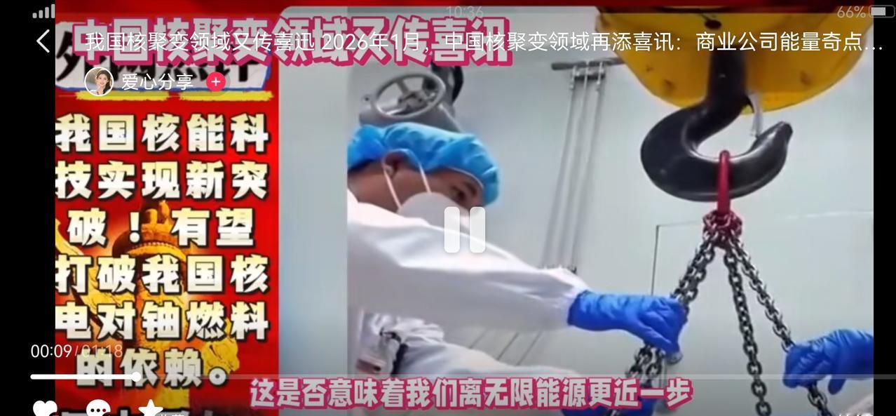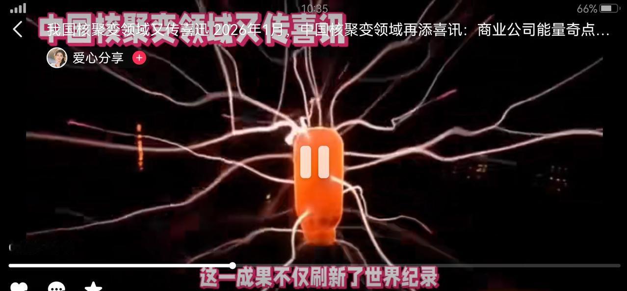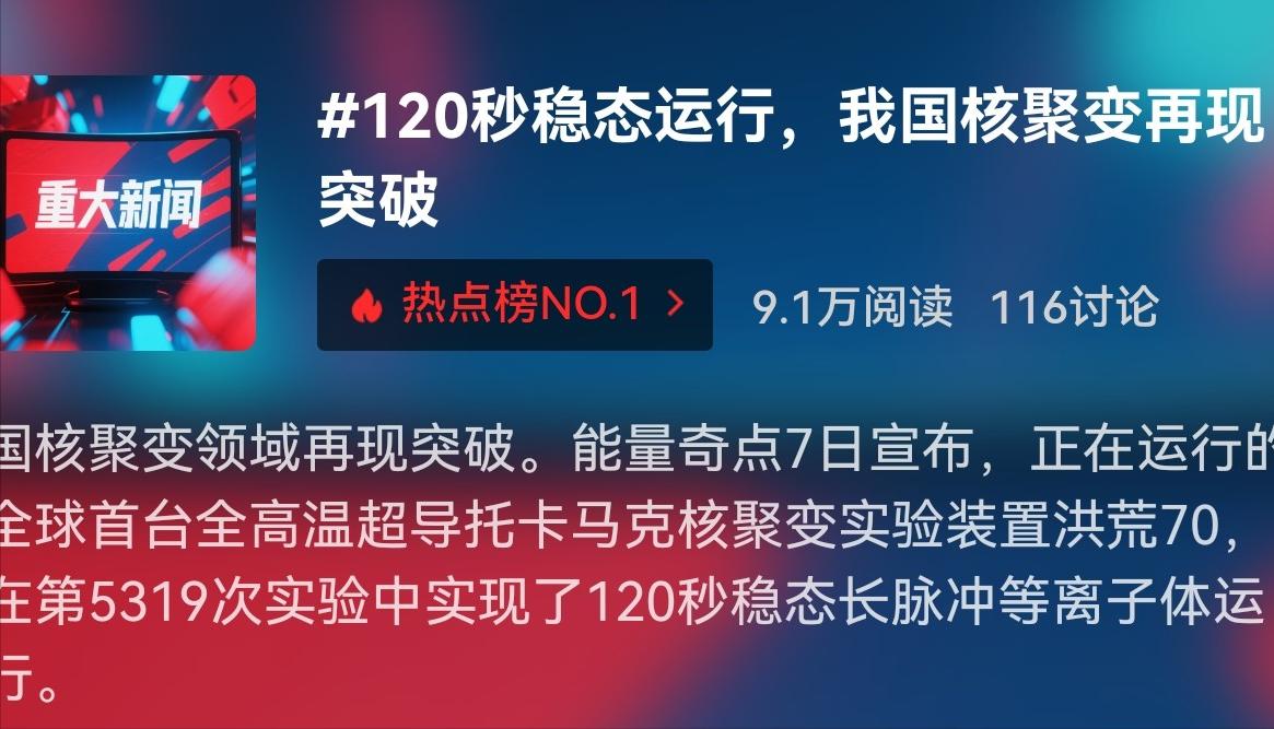 再突破!无限能源快来了!中国核聚变“洪荒之力”爆发 2026年1月7日,中国核聚变又炸出大新闻!能量奇点的“洪荒70”装置,全球商业公司头一回干成了大事——实现120秒稳态等离子体运行! 这可是全球商业公司头一回干成这件大事,相当于在追逐“无限能源”的赛道上,中国企业率先跑完了关键一程。 先给大家科普下,核聚变这事儿说白了就是模仿太阳发光发热的原理,把氢的同位素氘和氚凑到一起,让它们在极高温度和压力下融合成氦,同时释放出巨大能量。 这种能源清洁无污染,原料还遍地都是——海水里就有大量氘,一升海水提炼的氘产生的能量,差不多相当于300升汽油,要是真能可控利用,人类就再也不用为能源问题发愁了。 但难就难在“可控”二字,等离子体温度能达到上亿摄氏度,比太阳核心还热,怎么把它稳稳“困住”并维持稳定运行,一直是全球科研界的难题。 这次“洪荒70”的突破,关键就在于“稳态”和“120秒”这两个关键词。要知道,之前很多核聚变实验都是“瞬间闪一下”就结束了,而要实现发电,必须让装置稳定运行足够长时间。 “洪荒70”作为全球首台全高温超导托卡马克装置,这次在第5319次实验中达成的120秒稳态运行,意味着它已经具备了可靠的长脉冲运行能力,也验证了高温超导这条技术路线的可行性。 更值得骄傲的是,这台装置的国产化率超过96%,从磁体系统到射频波驱动系统,大部分核心部件都是咱们自己研发的。 可能有人会好奇,商业公司搞核聚变,和科研机构有啥不一样?要知道,之前全球核聚变研究大多靠政府主导的科研项目,周期长、投入大。 而能量奇点作为国内首家聚变能源商业公司,2021年才成立,短短几年就拿出了这样的成果,速度之快超出很多人预期。 从2024年6月首次实现等离子体放电,到2024年底中心磁场突破1T,再到2025年完成一系列系统升级,直到这次实现120秒稳态运行,短短两个月就完成了从启动长脉冲实验到突破百秒的跨越,这种高效的迭代速度,正是商业研发的优势所在。 当然,咱们也得客观看待,120秒离真正商业化发电还有不小距离。但这个突破的意义,在于它打开了商业化的想象空间。高温超导技术让装置变得更紧凑、成本更低,比如“洪荒70”的直径只有国际热核实验堆(ITER)的1/8,未来有望把建造周期从几十年缩短到三四年。 北京大学的研究员就评价说,这次实验达到了验证工程可靠性的目标,为后续更高参数的装置研发铺平了道路。按照能量奇点的计划,下一步他们要研发“洪荒170”装置,目标是实现净能量增益,也就是产出的能量比输入的多,这才是核聚变商业化的关键门槛。 这不是中国在核聚变领域的第一次突破。就在不久前,中科院合肥物质科学研究院的EAST装置,还实现了上亿摄氏度1066秒的稳态运行,创下世界纪录。 一边是科研机构深耕基础研究,一边是商业公司加速技术转化,两条腿走路的中国核聚变研究,正在不断拉近和“无限能源”的距离。资本市场也敏锐地捕捉到了这一信号,可控核聚变指数近期持续上涨,足以说明市场对这项技术的期待。 120秒的稳态运行,看似短暂,却承载着人类对清洁能源的终极梦想。它告诉我们,“无限能源”不再是科幻小说里的概念,而是正在一步步变成现实。 随着技术的不断突破,或许在不远的将来,我们就能用上核聚变发的电,到时候电价可能大幅降低,环境污染问题也能得到极大缓解。 而中国在这条赛道上的持续领跑,不仅能让我们率先受益于聚变能源,更能在全球能源格局中掌握主动权。这场由中国“洪荒之力”引领的能源革命,才刚刚拉开序幕。