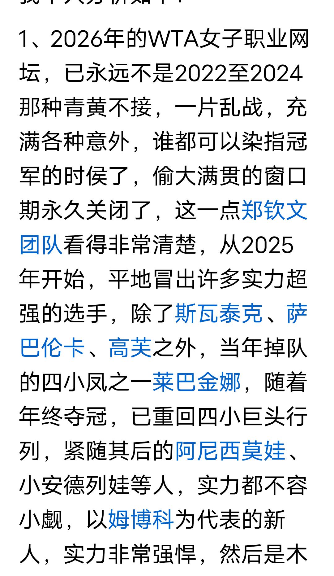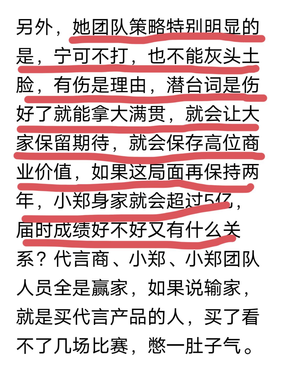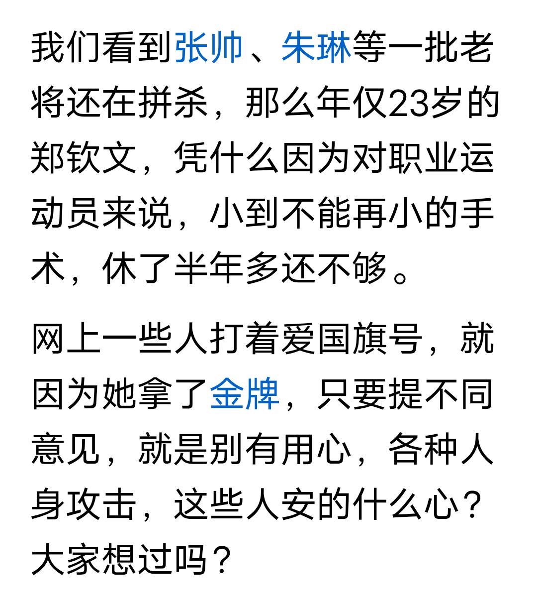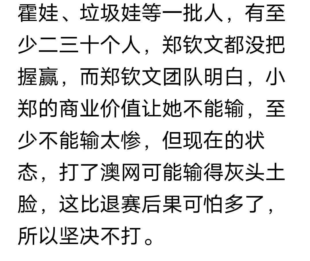 郑钦文退赛,这是我看到的写的最中肯的文章! 郑钦文澳网夺得亚军以后,各种荣誉纷至沓来,那个时候还好,也仅仅是个亚军,但后来夺得奥运冠军以后,就被捧上了天! 懂网球的都懂,奥运网球比赛,对于网球这项运动来说,就是个鸡肋,因为很多职业网球运动员是不参加的,但一旦和爱国扯上了边,就开始了造神,得了个并不被很多职业网球运动员重视的奥运冠军,就被捧为了中国网球第一人,就连两次夺得大满贯冠军的李娜都没有这样被捧到天上去! 正如文中所说,现在的女子网坛早已经不是02到04赛季那样青黄不接,谁都可以染指冠军的时候了,也不是谁都能靠运气闯进大满贯决赛了,目前女子网坛至少有20人实力在郑钦文之上,与其让她在大满贯上输的灰头土脸,退赛无疑是最好的选择!因为郑的商业价值不能让她输! 从2025年的下半年开始,郑就频繁的参加各种商业活动,大肆捞金,哪来的时间训练?都知道职业运动员是不能随便减少训练量的,当年的四大天王,现在的辛纳和阿尔卡拉斯,这样的天才选手都不敢轻易的减少训练量,何况郑? 文中质疑到,张帅,朱琳等一批老运动员还在拼杀,年仅23岁的郑,凭什么一个小的不能再小的小手术都大半年了还不能比赛? 很多人不允许对郑钦文提出质疑,否则就无端的攻击和谩骂,文中提到这样的人分为两类,第一类人是坏,是既得利益者,我认为第二类人更多,就是单纯的蠢!