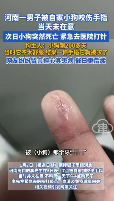 河南,一男子被自家狗子咬伤手指后没在意,结果第二天狗子突然身亡,吓得男子赶紧到医院接种狂犬疫苗!虽然男子已经接种了第一针狂犬疫苗和免疫球蛋白,但网友还是很担心男子。 养宠物的人谁还没个和毛孩子亲密互动的日常?河南这位大哥的经历却让人捏了一把冷汗,好好的小家宠突然闯下 “大祸”,还把主人吓得魂飞魄散。 事情要从一只才 200 多天的小狗说起,这只小狗是大哥从小养到大的,圆滚滚的身子,平时温顺得不行,黏人黏得厉害,走哪儿跟哪儿,是家里妥妥的 “开心果”。 那天大哥下班到家,天都快黑了,往常热热闹闹的客厅居然安安静静的,他还纳闷呢,喊了两声小狗的名字,半天没见回应。 低头一瞅,小家伙居然蜷缩在沙发底下,脑袋耷拉着,连平时最爱的鸡肉干扔到跟前,都只是抬了抬眼皮,连动都懒得动。 大哥心里咯噔一下,寻思着是不是白天没人在家,小狗着凉了,还是吃了什么不干净的东西闹肚子。 他赶紧蹲下来,慢慢挪到沙发边,想伸手摸摸小狗的耳朵,看看有没有发烧 ,毕竟养了大半年,早把它当成家里一口人了,哪儿能不心疼呢。 可谁能想到,平时随便撸、随便抱都温顺得像块棉花糖的小狗,突然跟炸了毛似的,猛地抬起头,嘴里发出 “呜呜” 的低吼,不等大哥反应过来,尖尖的牙齿就咬在了他的食指上。 “哎哟喂!” 大哥疼得下意识缩回手,一看,食指上已经多了一道半厘米长的口子,鲜红的血珠顺着伤口往下渗,疼得他直咧嘴。 “当时我还挺纳闷呢,这小家伙平时跟我最好,怎么突然就翻脸了?” 大哥后来跟医生念叨的时候,还一脸不可思议,他说自己当时光顾着琢磨小狗是不是真不舒服,压根没往危险那方面想。 毕竟是自家从小养到大的狗,每天都拴在家里,除了下楼遛弯就是待在屋里,连流浪猫狗都没接触过,能有啥问题? 于是大哥就随便走到水龙头底下,用凉水冲了冲伤口,找了张创可贴一贴,又蹲下来对着小狗说了几句 “你是不是不舒服啊,别闹脾气”,还给它换了干净的狗窝,倒了新鲜的温水,想着过一晚说不定就好了。 可谁能料到,这竟是他跟小狗的最后一面。第二天早上六点多,大哥醒了第一反应就是去看小狗,走到狗窝跟前,只见小家伙还是保持着昨晚蜷缩的姿势,一动不动。 他心里一紧,赶紧伸手去碰,这一碰可把他吓得魂飞魄散,小狗的身体已经凉透了,僵硬得不像样子。 “狂犬病” 这三个字像惊雷一样在他脑海里炸开,他越想越害怕,赶紧换了衣服就往医院跑,一路上手心全是汗,连方向盘都快握不住了。 到了医院的狂犬病暴露预防处置门诊,医生一听说情况,立刻就给他做了检查,伤口虽然不大但属于贯穿性咬伤,再加上咬人的小狗已经死亡,直接判定为 Ⅲ 级暴露,必须马上处理伤口并接种疫苗和免疫球蛋白。 医生先用肥皂水和流动清水交替给大哥的伤口冲洗了 15 分钟,边冲边提醒他,被动物咬伤后这一步最关键,能直接减少伤口表面的病毒。 冲洗完消毒后,又根据他的体重计算了免疫球蛋白的剂量,在伤口周围做了浸润注射,随后接种了第一针狂犬病疫苗。 医生特意叮嘱,后续还要按照 “2-1-1” 免疫程序,在第 7 天和第 21 天分别接种疫苗,全程不能间断,期间还要注意伤口护理,避免感染。 大哥说,整个过程下来又紧张又懊悔,花了一千多块钱不说,一想到狂犬病病死率几乎 100% 的说法,就忍不住后怕。 他后来才知道,自家小狗因为才 200 多天,刚打完前几针多联疫苗,还没到接种狂犬疫苗的时间,可能是在外面接触了不明动物,才染上了致命的疾病。 当时小狗不舒服,其实已经是发病的前兆,自己没及时察觉,还贸然伸手,才酿成了这样的惊险局面。 这件事被大哥发到网上之后,瞬间就引发了网友的热议,大家都替他捏着一把汗。 有网友留言说:“我的天,狗第二天就没了,这也太危险了,一定要按时打完所有针啊,每天都来报个平安!” 还有网友分享了自己的经历:“我之前被自家猫抓伤了个小口子,没出血就没管,后来刷到狂犬病的科普,吓得连夜去医院接种疫苗,现在还在观察期,真的不能心存侥幸。” 不少养宠网友也纷纷现身说法,提醒大家注意:“千万别觉得自家宠物干净就没事,很多时候动物携带病毒但表面看不出来,尤其是没完成全程疫苗的幼犬幼猫,风险更高。 养宠物不仅要享受它们带来的陪伴和快乐,更要承担起责任,定期带宠物接种疫苗,做好防护措施。 同时,也要多学习狂犬病防治知识,知道被咬伤后该如何正确处理,毕竟生命没有重来的机会,任何一次疏忽都可能酿成无法挽回的后果。 对于这件事,您有什么想说的吗?欢迎评论区留言讨论。 信源:光明网2026-01-07——《男子被咬不在意 次日狗死亡紧急打针》