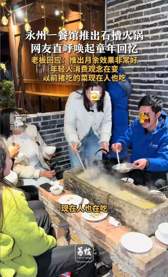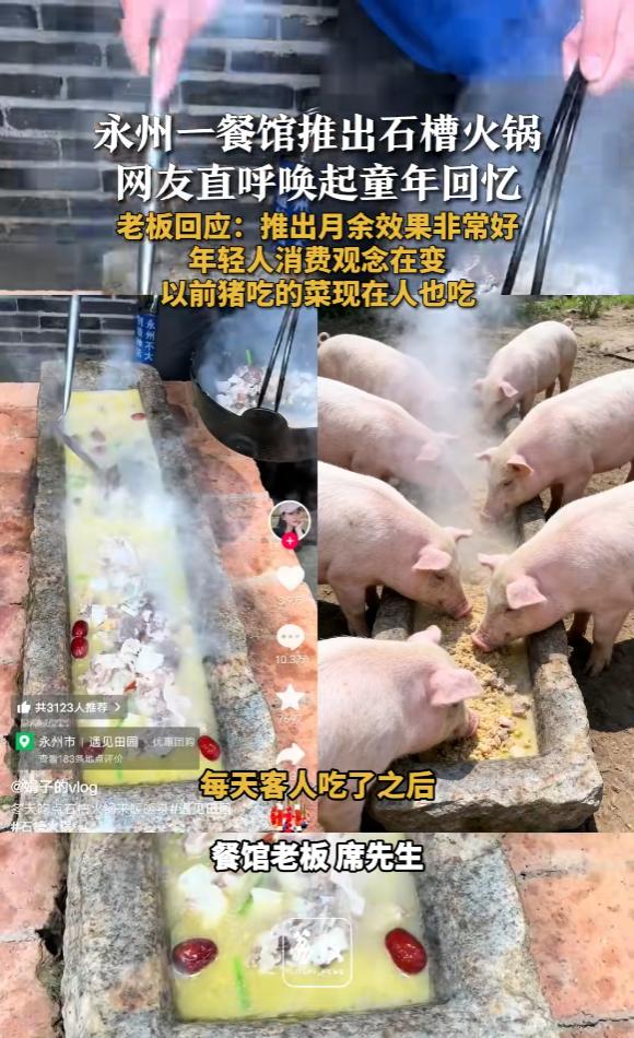 “活久见!”近日,湖南永州,一老板为了吸引顾客, 就结合店里特色推出了“石槽火锅”,却因为石槽造型像极了猪吃的槽子被吐槽,但还是有不少人觉得新鲜去打卡,生意非常火爆!老板:消费观念在变,猪吃的菜现在人也吃! 如果光看这口锅的造型,确实容易让人产生某种“时空错乱”的错觉。这是一整块老青石打磨而成的容器,足足有一米长,三十厘米宽,深度也达到了十多厘米。它静静地躺在特制的铁支架上,底下的红炭正旺,把青石内部熬煮的汤底催得咕嘟作响。 为了配合这口“庞然大物”,服务员端上来的加汤壶和盛菜勺子全是大号版本。甚至有爱开玩笑的食客在打卡视频里调侃:“是不是开吃前,还得听服务员拿勺子敲一下石槽沿口,这顿饭才算真的对味?”这句关于“条件反射”的戏言,在网上引发了无数共鸣,直接把这顿饭的“喂猪感”拉满。 农庄主人席一飞,这位在餐饮行当里摸爬滚打了六年的老手,是个狂热的老物件收藏癖。他的院子里原本就堆满了四处收来的石缸、石鼓和石凳。一个多月前,也就是2024年的尾巴上,他看着满院子的石头和当下略显疲软的经济环境,脑子里突然蹦出了个大胆的念头。 “现在的人吃饭,光好吃不行,得有乐子。”席一飞很清楚,在这个短视频称王的时代,传统的圆锅圆盆早就审美疲劳了。他把目光锁定在了那些长条形的老石头上为什么不能在容器上搞点反差感?于是,这些原本只能当摆设的老青石被拉去重新切割、打磨,甚至请朋友来反复试吃,测试石头的导热性和安全性。 这种“把猪槽搬上餐桌”的行为艺术,必然伴随着巨大的争议。网络评论区两极分化严重:一拨年轻人惊呼“活久见”,觉得既复古又朋克,争着来体验这种粗犷的田园风;另一拨人则生理不适,担忧卫生问题,甚至觉得自己受到了冒犯。 “这些石头其实和大家平时吃的石锅饭材质没区别,根本不是哪怕刷干净了大家心里也膈应的真猪槽。”面对卫生质疑,席一飞显得很坦荡。他强调每一口石槽都是由老石头改造的新餐具,每次使用后都会进行彻底清洗。对于餐饮人来说,食品安全这条底线是万万不敢碰的。 更有趣的是老板对于当下消费观念的洞察。当被问及“为何让顾客体验这种类似家畜进食的方式”时,他给出了一个颇具黑色幽默却又无比现实的回答:“现在的消费观念变了,哪怕是以前猪吃的菜、猪用的槽,只要有新意,现代人也愿意尝试。”这番话里,既有对市场的妥协,也有一种看透本质的通透。 事实上,这口能容纳八人同时进食的石槽锅,确实成了一个不折不扣的“流量磁铁”。从这一个多月的运营数据来看,席一飞“赌”赢了。周末的席位基本已经被预订一空,不少还是特意慕名而来的年轻人。虽然目前店里只有两口这样的定制石槽,实行限量供应,但这恰恰制造了一种稀缺感。 生意经:不只是为了卖一顿火锅 如果你以为这老板费这么大劲,仅仅是为了卖几十块钱一个人的火锅,那就太小看这位“老江湖”了。席一飞在永州的这片产业,前后投入了四百多万元。这是一个能同时容纳四十多桌客人的大型文旅农家乐。除了这风口浪尖上的火锅,园子里还能摘草莓、钓鱼,搞围炉煮茶。 他把石槽火锅的人均消费定在了30到50元这个极其亲民的区间,甚至可以说是有点“赔本赚吆喝”的意味。 但这背后的账,算得比谁都精。2025年底这个时间节点,对于很多实体老板来说都是道坎,必须寻求经营上的突破口。这口自带话题的“石槽锅”,就是一个完美的“引流产品”。 只要食客被这个新鲜玩意儿吸引进园子,他们就可能去采摘几十块钱的草莓,可能会坐下来钓一下午鱼,或者在这个充满了田园野趣的环境里产生其他的消费。用低价的爆款项目把人带进来,再通过丰富的体验留住客,这才是他“遇见田园”真正的商业逻辑。 甚至对于同行们的觊觎,席一飞也表现得异常开放。自从石槽火锅火了之后,想来取经的、想谈加盟的同行踏破了门槛。但他目前还没打算放开加盟,只是专注于打磨自己的产品。他对那些想要模仿的人并不排斥,毕竟在他看来,把整个农家乐体验做得更丰富,远比守着一口锅的专利要重要得多。 在这升腾的蒸汽背后,我们看到的是一个传统餐饮人面对变化莫测的市场时,那种绞尽脑汁的求变欲。无论你是嘲笑它像“喂猪”,还是赞美它“怀旧”,都无法否认,这块石头确实在寒冬里,激起了不小的水花。 对于食客而言,这或许只是一次新奇的打卡;但对于经营者来说,这是在这个充满不确定性的时代里,用力砸向水面的一颗问路石。