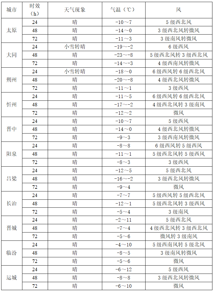 -气温:降温超明显,北中部部分地方还会遭遇寒潮。最高温:北部及中南部山区-4~6℃,中南部其余地方6~13℃;最低温:高寒地区约-21℃,北部及中南部山区-18~-10℃,中南部其余地方-10~-3℃,早晚冻感十足。