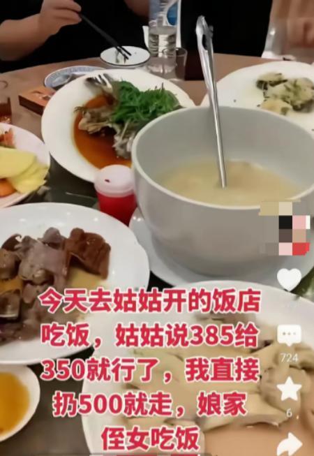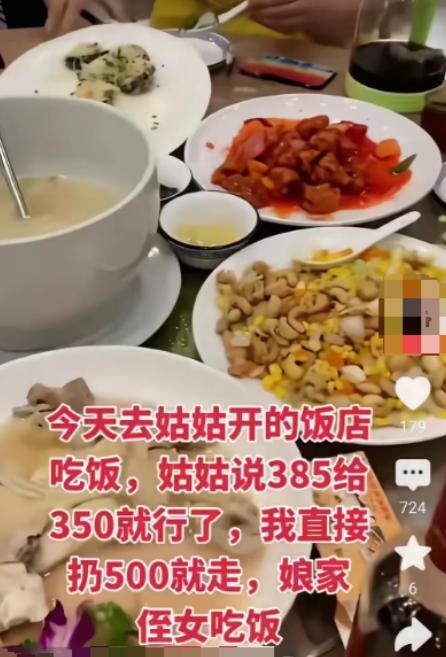 一女子带朋友去姑姑开的饭馆吃饭,买单时,姑姑说385块给350块就行了。女子听后