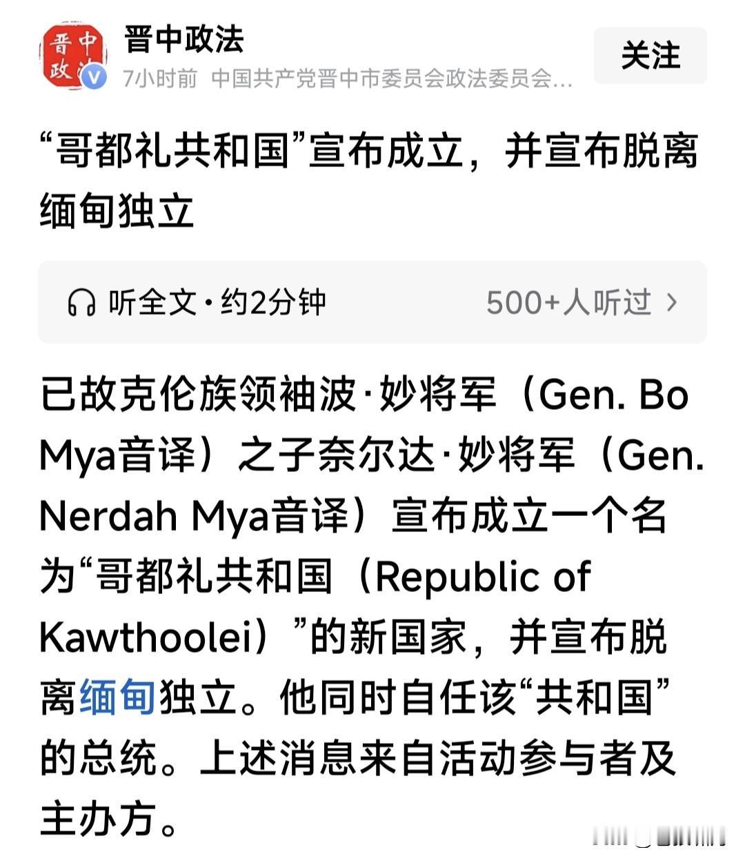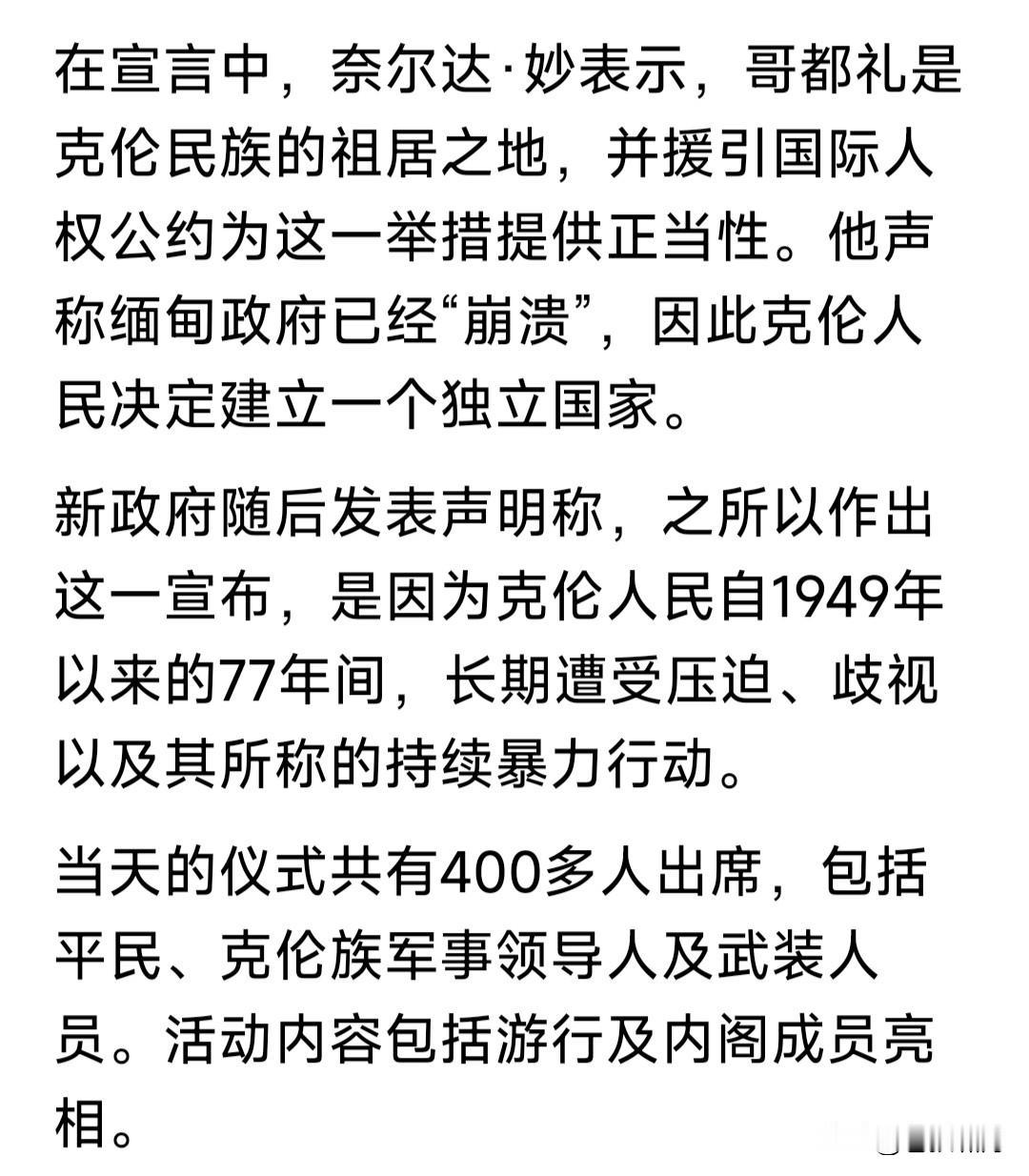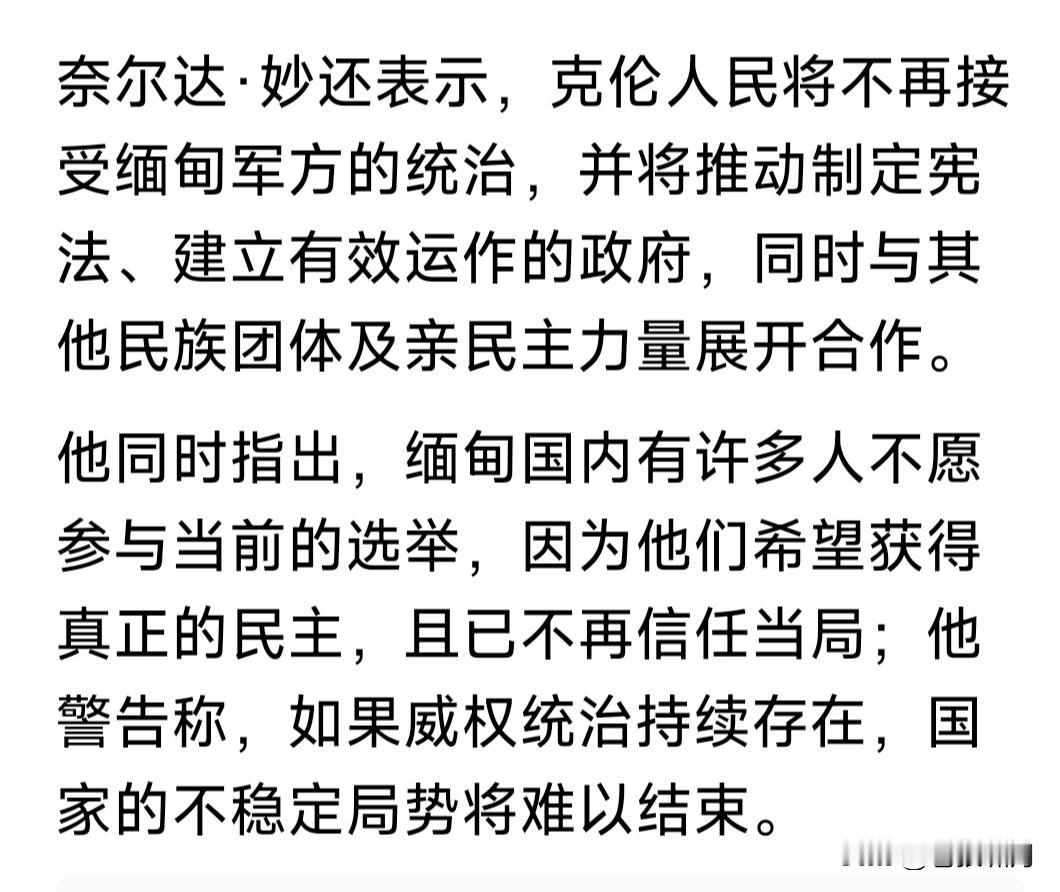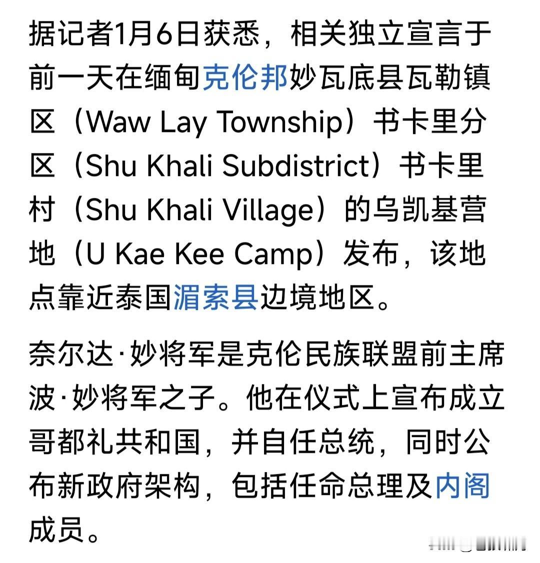 惊讯!缅甸克伦族建立共和国,并宣布脱离缅甸独立!军政府如何应对? 克伦是一个小民族,是否独立不足为虑,缅甸军政府好应对!但如果发生骨牌效应,其他民族效仿该怎么办? 缅甸是多民族国家,北部山区是少数民族。他们是自治邦,各自有军队,因利益争夺,多次与军政府发生冲突。 比如这两年,政府军多次与果敢/克钦军队发生战斗,双方互有伤亡,之后妥协随后再打,严重影响经济发展。 现在的问题是,若克伦共和国建立,发生骨牌效应,克钦/掸邦/佤邦/果敢等地区也照此办理,岂不是乱套了? 此前缅甸政府军,与果敢/克钦等军队作战都不占优势,如果这么多民族都闹独立,缅甸这个国家将向何处去? 缅甸与中老泰三国接壤,如发生动乱,将对三国发展产生严重干扰。缅泰老边境有个“金三角”,臭名昭著的“妙瓦底”就在这里!现在是否“改邪归正”? 期望缅甸紧随世界潮流,实现文明民主法治!期望中国周边,不要发生动乱。各国睦邻友好和平相处,互相促进发展经济,为国强盛为民谋福多好啊! …………