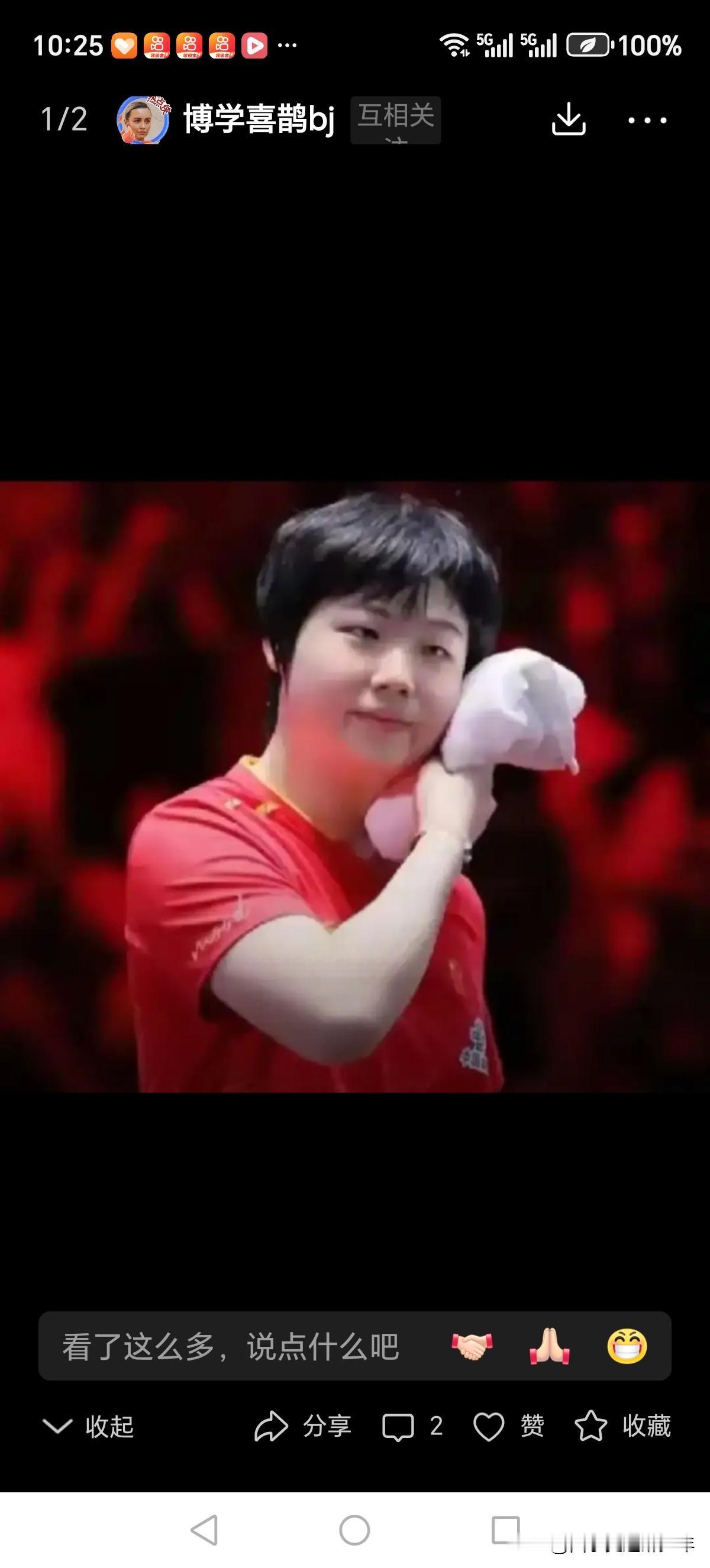WTT多哈冠军赛女单1/8决赛: 蒯曼VS早田希娜。 蒯曼已经进入主力阵容,相信一定能战胜早田希娜晋级八强。 第一局蒯曼开局被追平并反超,3:6落后,追至6:7落后,6:8落后,6:10落后,7:11输了首局。 第二局蒯曼4:1领先开局,5:1领先,7:3领先,8:5领先,8:6领先,9:8领先,被追上来了,加油啊?追至9平,蒯曼发球,错过机会,10平了,12:10还是拿下来了。 第三局蒯曼3:2领先开局,4:2领先,6:2领先,7:3领先,8:3领先,拉开比分了,8:6领先了,9:6领先,10:6领先,我们局点又到了,10:8领先,现场有飞虫吗?蒯曼不停的拍打,还好,没有受影响,11:8又赢了。 第四局蒯曼开局打成2平,6:3领先,7:3领先,7:5领先,8:6领先,10:6领先,赛点到了,早田发球失误送分,够意思,11:6再赢第四局,祝贺蒯曼晋级八强。 看:我们的蒯曼多漂亮。