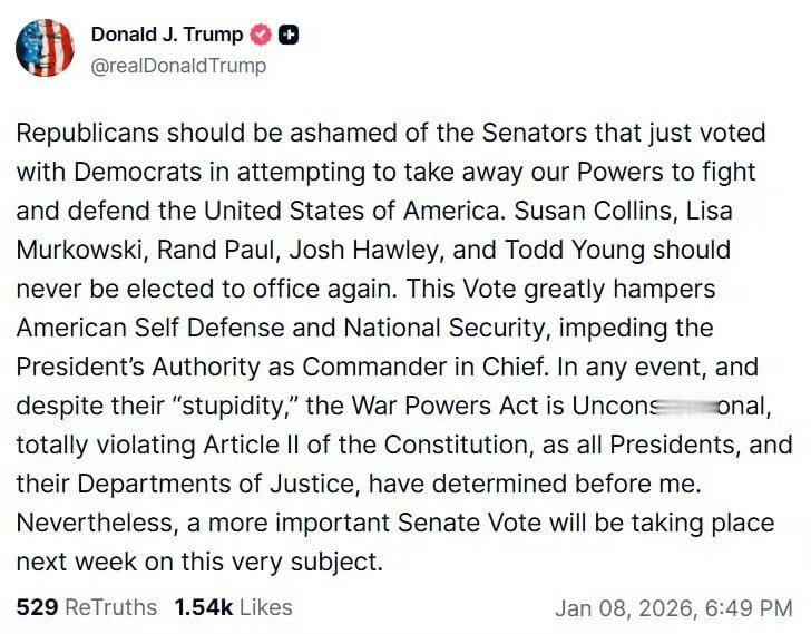 特朗普通过 Truth Social 发声: 共和党人应该为那些刚刚与民主党人投票、试图剥夺我们保卫美利坚合众国权力的参议员感到羞耻。 苏珊·柯林斯、丽莎·穆尔科斯基、兰德·保罗、乔希·霍利和托德·杨永远不应该再当选公职。 这次投票极大地阻碍了美国的自卫和国家安全,削弱了总统作为三军统帅的权威。 无论如何,尽管他们“愚蠢至极”,《战争权力法》是违宪的,完全违反了宪法第二条,正如在我之前的历任总统及其司法部所认定的那样。尽管如此,下周参议院将就同一议题进行一场更为重要的投票。