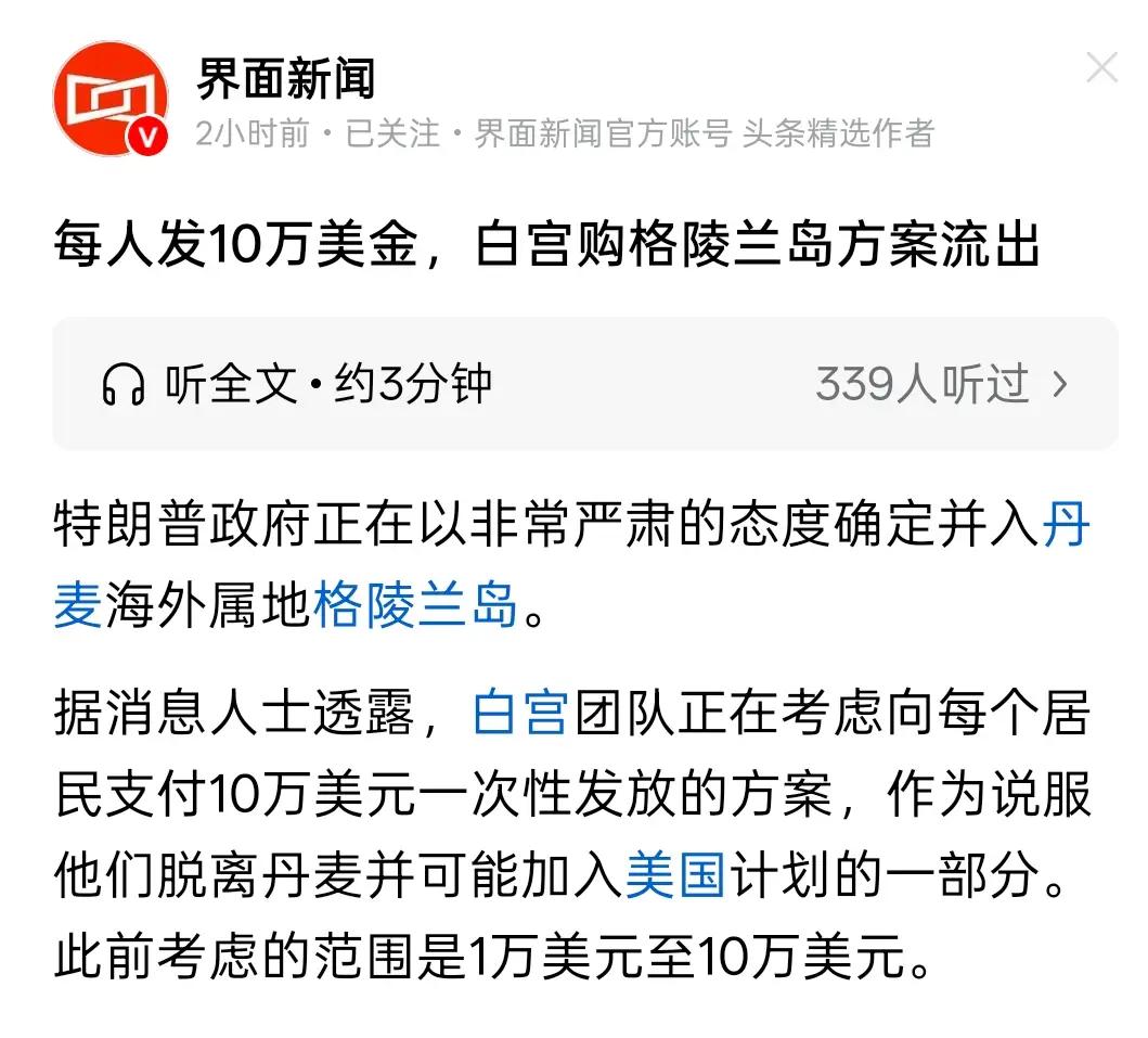 美国准备软硬兼施。先送大礼包。给格陵兰岛每个人发10万美元,买这个岛。 一口价对格陵兰岛的朋友不够友好,要不我们一起搞个拍卖会,其实我们但也不一定真买,但是可以把这个价给它抬上去。 比如,我们喊个20万。要是美国不跟,1000亿美元买这么大一个岛也还是划算。 这做法还可以运用到塔斯马尼亚。我觉得是可行的。[奸笑] 点右上角关注我,我们一起去看这个魔幻的世界