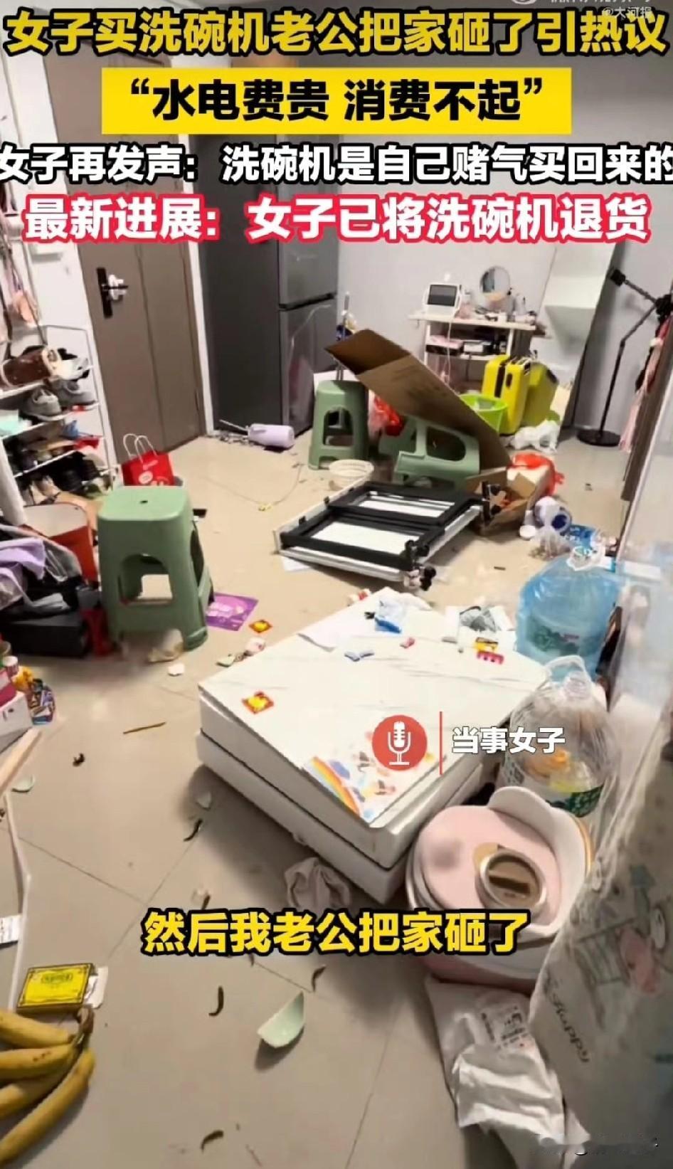 月入过万的家庭,咋还容不下洗碗机呢[思考]?1月7日的广东,一位女士嫌天太冷,自己带俩个孩子很累。就花了1000多元,买了一个洗碗机方便生活。 当安装师傅上门安装时,男主人嫌费水电,认为自己没同意,老婆私自就买了[机智]。于是怒火上头,在房子砸东西。 该女士把遭遇发到网上,说房子是出租的,自己看孩子没上班,老公还这样对她[捂脸]。但网友不太买账,大多人不支持她的行为。 事件后续是1月8日,女子说洗碗机已经退了。整件事就是,男的觉得压力大,女的觉得心寒。成年人的体面,有时真抵不过这一千块[叹气],这件事你是咋看的?来评论区说下你的看法吧[灵光一闪]。