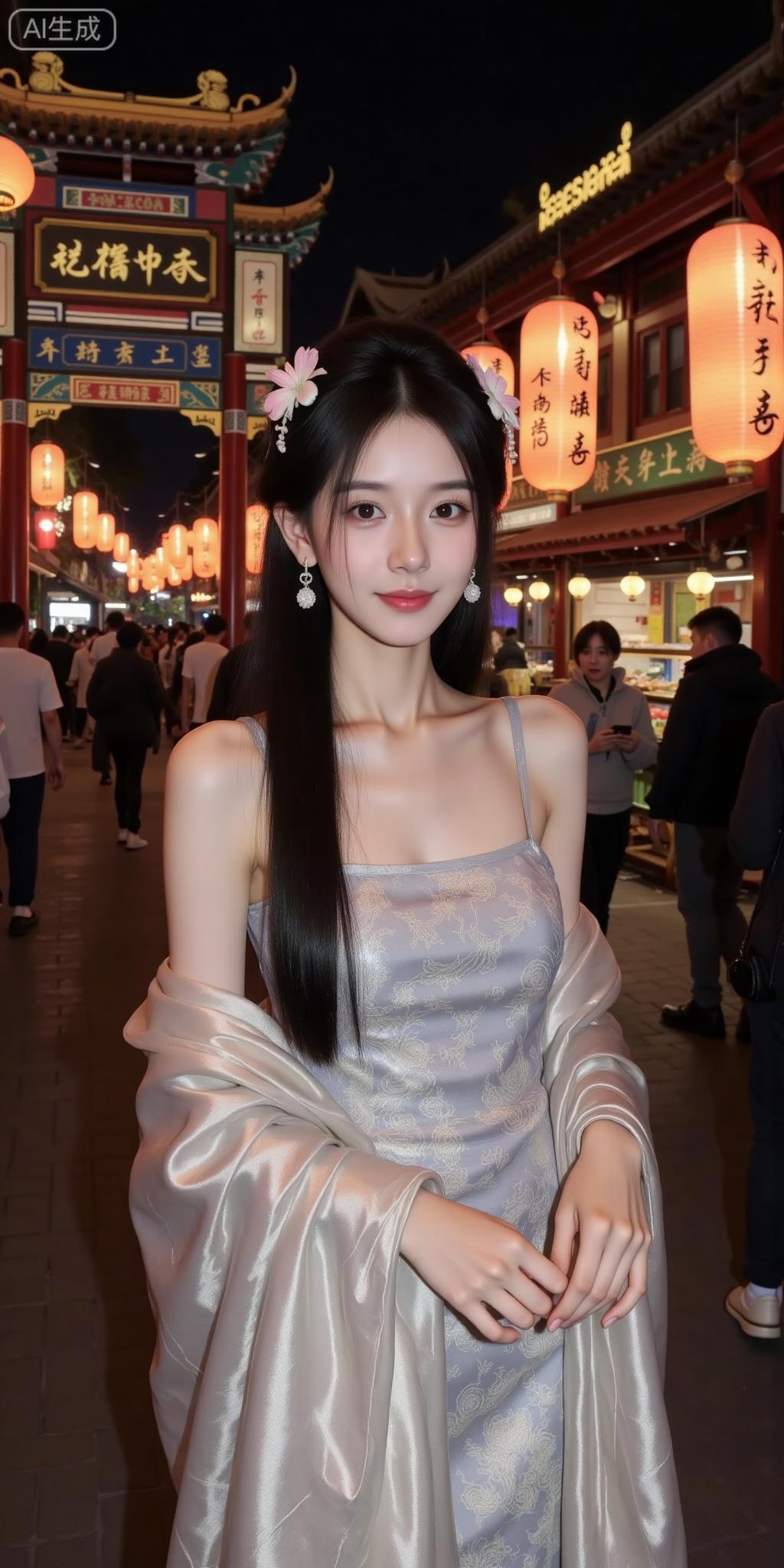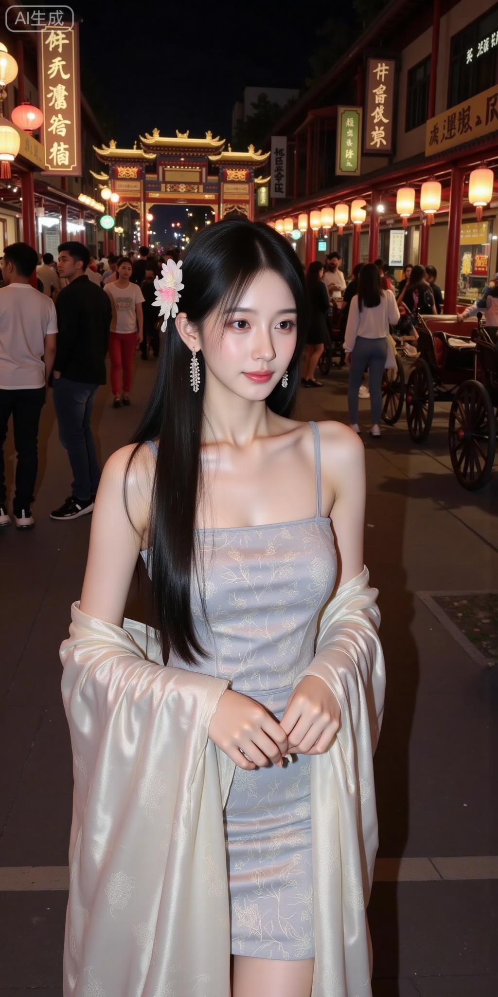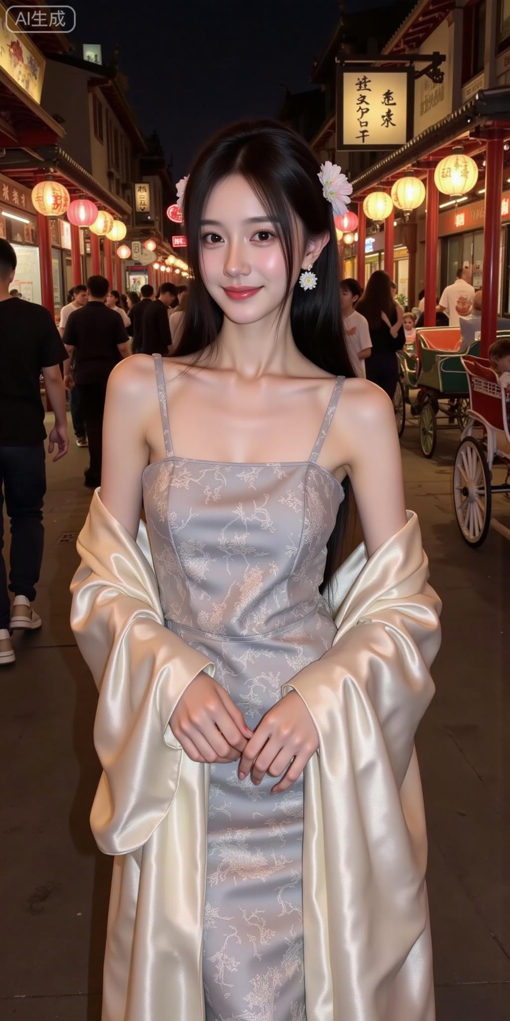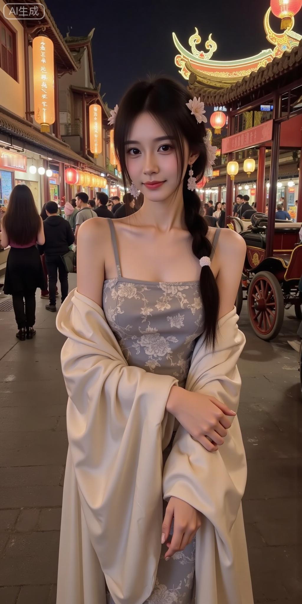 古巷夜色里的国风甜妹 灰调吊带衬着暗纹,轻纱外搭添了点柔媚~发间花饰配水晶耳坠,和身后灯笼古檐一搭,像从水墨里走出来的氛围感美人✨ 这是把古典甜揉进晚风里了吧!温柔国风美人