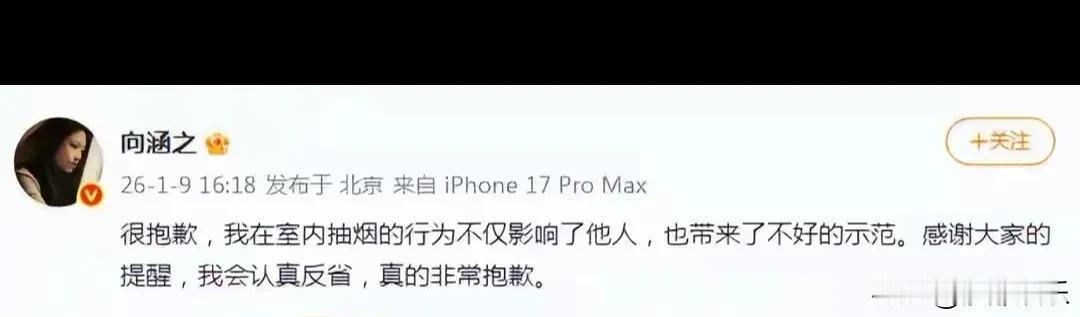向涵之棋牌室抽烟这事,道歉来得比外卖还快。刚被拍到,马上就认错,说“带来了不好示范”。这速度,公关部怕是练过百米冲刺。 说起来真有点讽刺。屏幕上她是清纯甜妹,私下烟圈吐得比台词还熟练。法规明摆着室内不能抽,但明星和咱普通人一样,觉得“就抽一根没事”。二手烟害人害己,道理都懂,就是管不住手。 道歉是好事,起码态度端正。但关键看以后,是真反省还是做样子。公众人物这碗饭,吃得是流量,扛得是责任。希望这回的“认真反省”不是句空话。毕竟,大家想追的是光,不是烟。 向涵之就室内抽烟行为道歉 向涵之 向涵之棋牌室抽烟