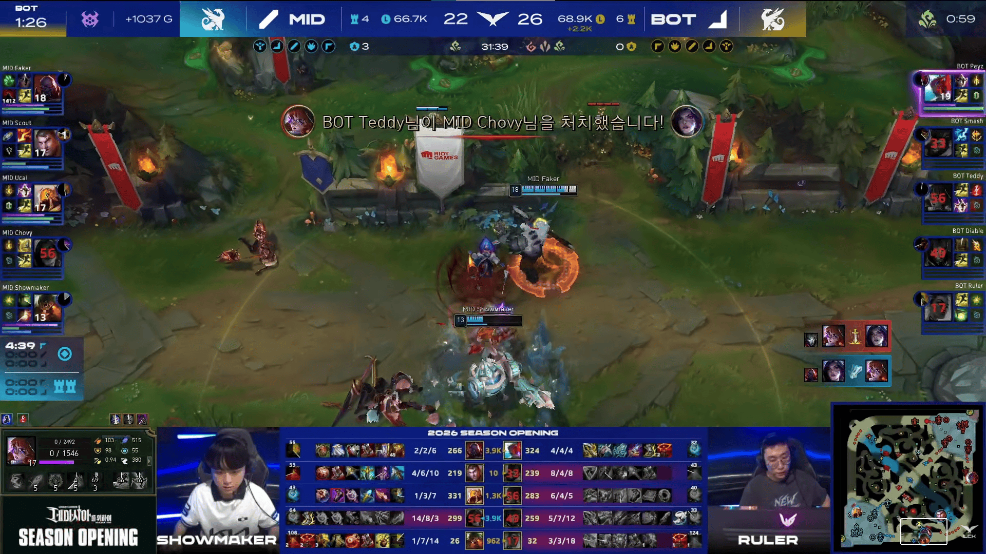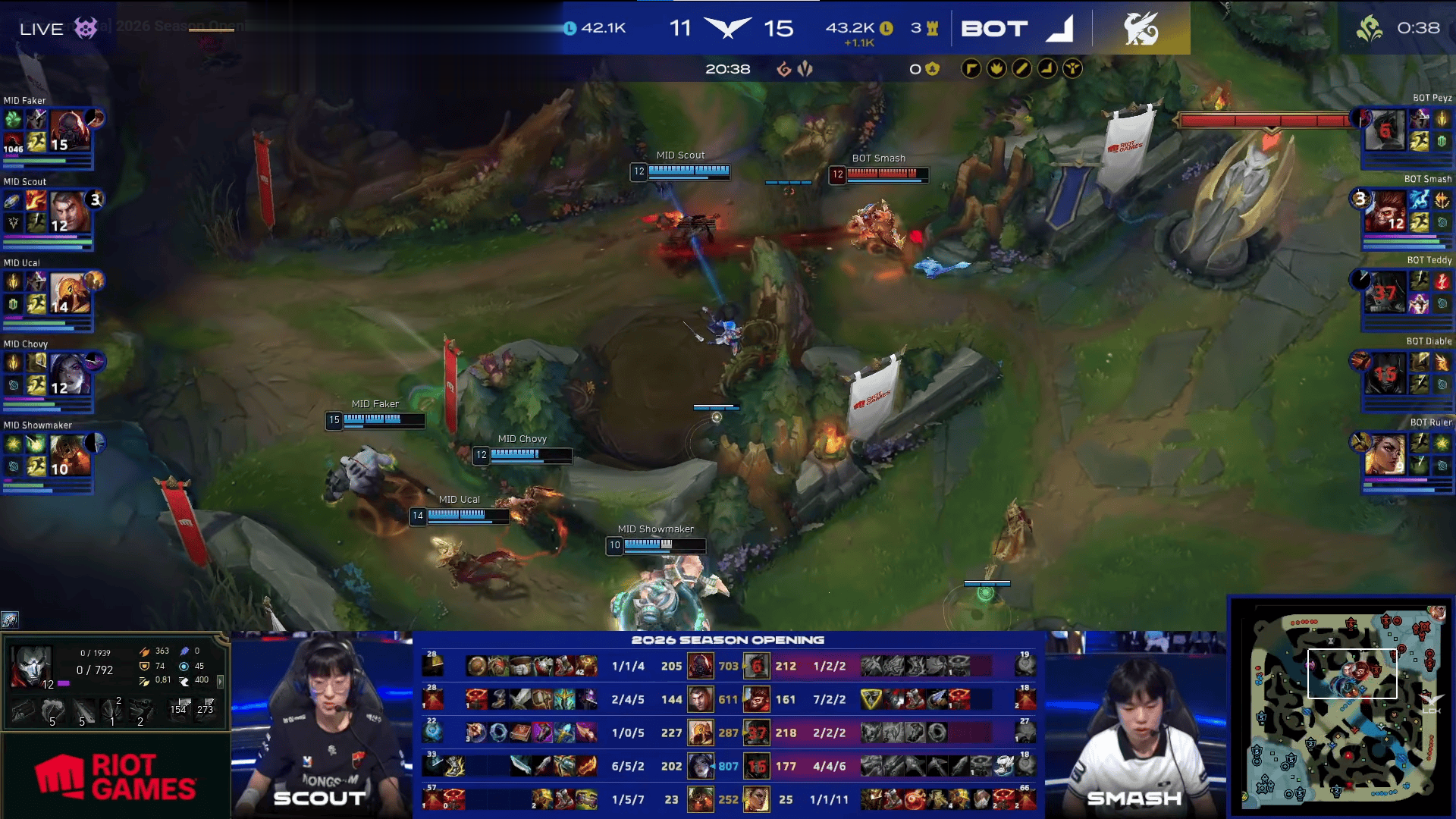 中单队选用:Faker塞恩、Scout杰斯、Ucal沙皇、Chovy卡莎、ShowMaker泰坦