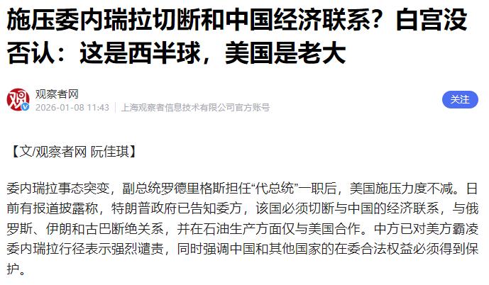 如果敢这么做,中国就不能忍了! 据美国ABC新闻报道,特朗普政府要求委内瑞拉断绝与中国、古巴、伊朗及俄罗斯的经济联系,还狮子大开口,逼迫委内瑞拉临时政府向美国输送3000万至5000万桶石油,以此作为放松对委制裁的交换条件,甚至放言若不照做,美军不排除对委内瑞拉实施二次军事打击。 这等强买强卖、恃强凌弱的霸道操作,不仅是对委内瑞拉国家主权的公然践踏,更是对中国等相关国家合法权益的恶意挑衅。 无论美国怎么狡辩,委内瑞拉在国际上仍是一个有主权的独立国家,有权自主决定与哪些国家开展经济合作,这是《联合国宪章》赋予每个主权国家的基本权利,任何外部势力都无权干涉。 但特朗普政府却视国际法如无物,将委内瑞拉当作可随意拿捏的“囊中之物”,一边动用军事力量施压,一边挥舞制裁大棒胁迫,其真实目的昭然若揭,无非是想通过控制委内瑞拉的石油资源,遏制中国、俄罗斯等国在拉美地区的影响力,进而巩固自身在全球的霸权地位。 1月3日绑架委内瑞拉总统马杜罗本就不和法理,如今又变本加厉,提出断绝与多国经济联系的无理要求,甚至试图将委内瑞拉的石油利益“吃干抹净”。 据报道,美国能源部长已明确表示,将无限期控制未来委内瑞拉的石油销售及所得收入,所有销售款项要存入美国政府控制的账户,美其名曰“造福委内瑞拉人民”,实则是赤裸裸的资源掠夺。 面对美国的霸道挑衅,中国早已亮明立场。 在1月7日的外交部例行记者会上,发言人明确表示,委内瑞拉是主权国家,对本国的自然资源和一切经济活动拥有充分的永久主权。美国悍然对委内瑞拉动武,并要求委内瑞拉处置自身石油资源时美国优先,是典型的霸凌行径,严重违反国际法,严重侵犯委内瑞拉主权,中方对此强烈谴责,同时强调中国和其他国家在委内瑞拉的合法权益必须得到保护。 不仅如此,国际社会对美国的行径也纷纷表达不满。联合国安理会曾就美国对委内瑞拉发动军事打击召开紧急会议,绝大多数国家表示谴责美方军事行动,支持委内瑞拉主权。联合国人权理事会16个特别机制更是发表联合声明,强烈谴责美国的行径。 墨西哥、哥伦比亚等拉美国家也爆发了声援委内瑞拉、抗议美国干涉的集会活动,批评美帝国主义在拉丁美洲死灰复燃。 就连美国国内,参议院也通过程序性投票,推进限制特朗普对委动武的决议,多名共和党议员倒戈支持,可见其行径连美国内部都难以认同。 特朗普政府大概忘了,当今世界早已不是霸权主义可以为所欲为的时代,各国人民都有权利维护国家主权和自身利益。中国一贯坚持独立自主的和平外交政策,尊重各国主权和领土完整,同时也绝不允许任何国家以任何借口损害中国的合法权益。 如果美国真的逼迫委内瑞拉做出断绝与中国经济联系的荒唐举动,那就意味着公然挑战国际秩序的底线,我们必然会采取有力措施予以反制,坚定维护自身利益和国际公平正义。