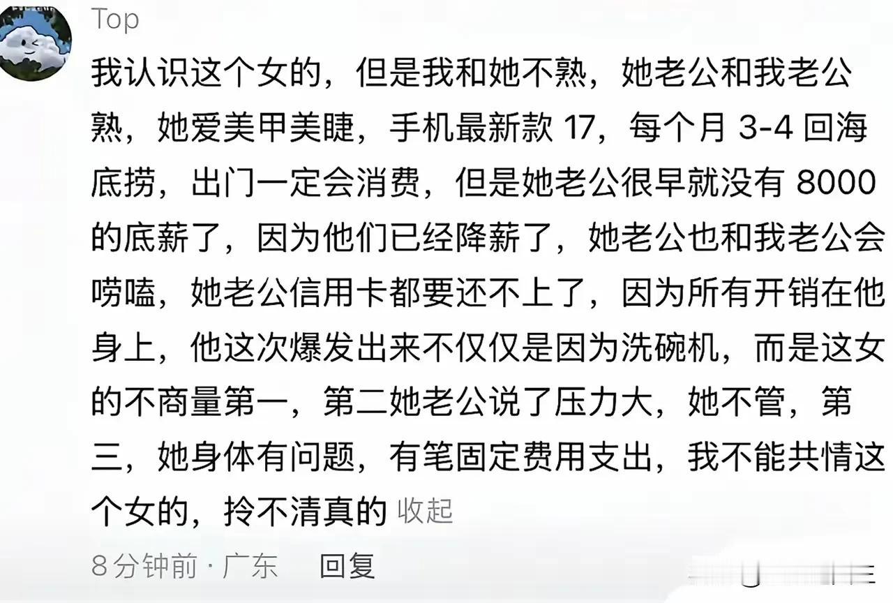 都是洗碗机惹的祸 你有没有发现,大家骂洗碗机事件里的女主,根本不是因为一个洗碗机。 她没工作、身体不好,家里还欠着20万的窟窿,转头却换了最新的苹果17,美甲做着、海底捞吃着,连个碗都懒得洗,非要买洗碗机图省事。 她总觉得老公月入一万很轻松,却看不见他加班到深夜的疲惫;她住着局促的房子,却把自己收拾得光鲜亮丽,和家里的拮据格格不入。 最让人意难平的是什么?是她欠着钱,却一点没有省吃俭用还债的心思,反而先顾着自己享受。换作是你,借出去20万,对方拿着你的钱做美甲、下馆子,就是不还钱,你能不气吗? 老公的暴怒哪里是冲洗碗机来的,那是攒了无数个日夜的委屈和失望啊。他不是苛待妻子,是扛不住“一个人养家,另一个人只顾享乐”的落差;砸的不是家,是压垮他的最后一根稻草。 冰冻三尺非一日之寒,压垮一个男人的,从来都不是一件小事。