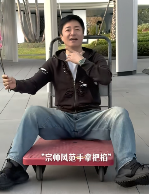 1月9日,56岁的何中华坐在手推车上,手持一支桃花,边走边说:“我是主唱邓太阿,手拿桃花唱嗨歌,倒骑毛驴挥舞桃花,宗师风范手拿把掐。”