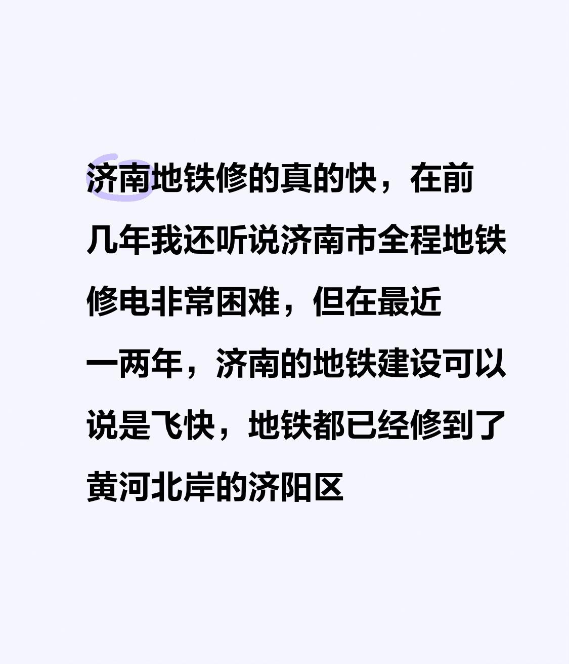 济南地铁修的真的快,在前几年我还听说济南市全程地铁修电非常困难,但在最近一两年,济南的地铁建设可以说是飞快,地铁都已经修到了黄河北岸的济阳区