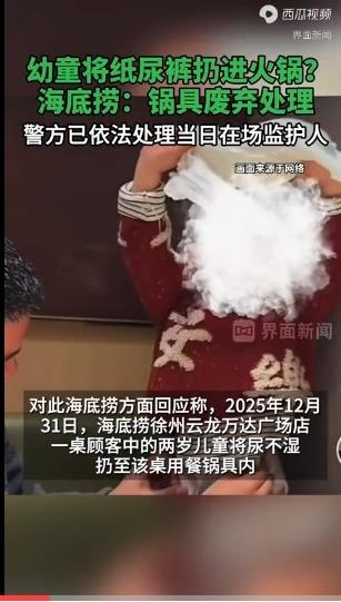 山东徐州, 海底捞火锅桌旁,一年轻父亲,在给2岁幼儿换纸尿裤,年轻母亲则在对面拍视频,记录这温馨的一幕。 幼童将纸尿裤高高举起,扔进桌上用餐锅具内。“乖宝贝,拍到了” ,母亲抓拍好视频,之后把视频上传到社交平台。 对他们来说,自己小孩身上啥都是香的。 这事发生在2025 年 12 月 31 日,门店及时对锅具进行废弃处理,并报警,该地警方已依法作出相应处理。